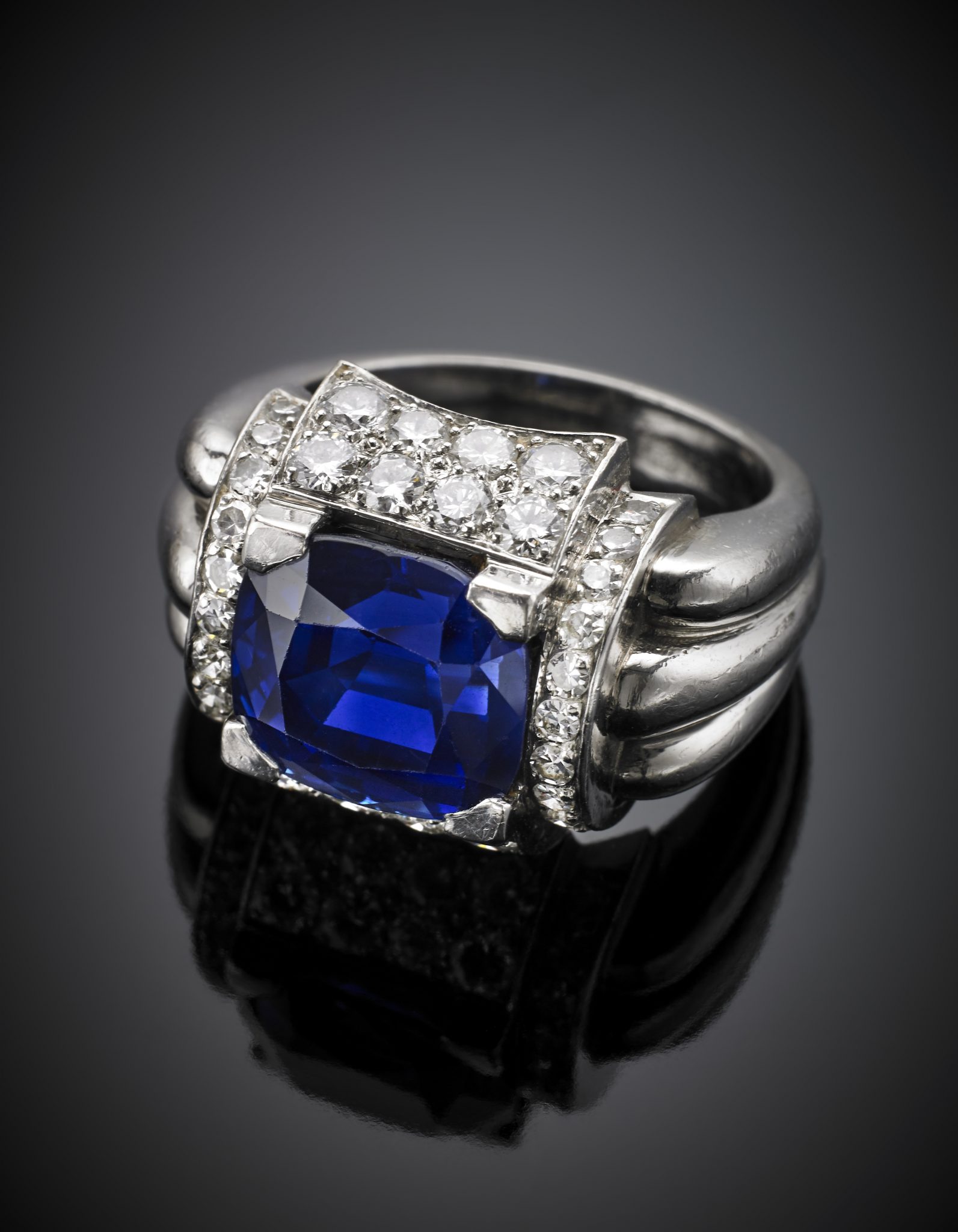 Anello in platino, a nervature con zaffiro centrale a cuscino di ct. 9,40 circa rifinito con diamanti rotondi, g 20,68 misura 15/55.