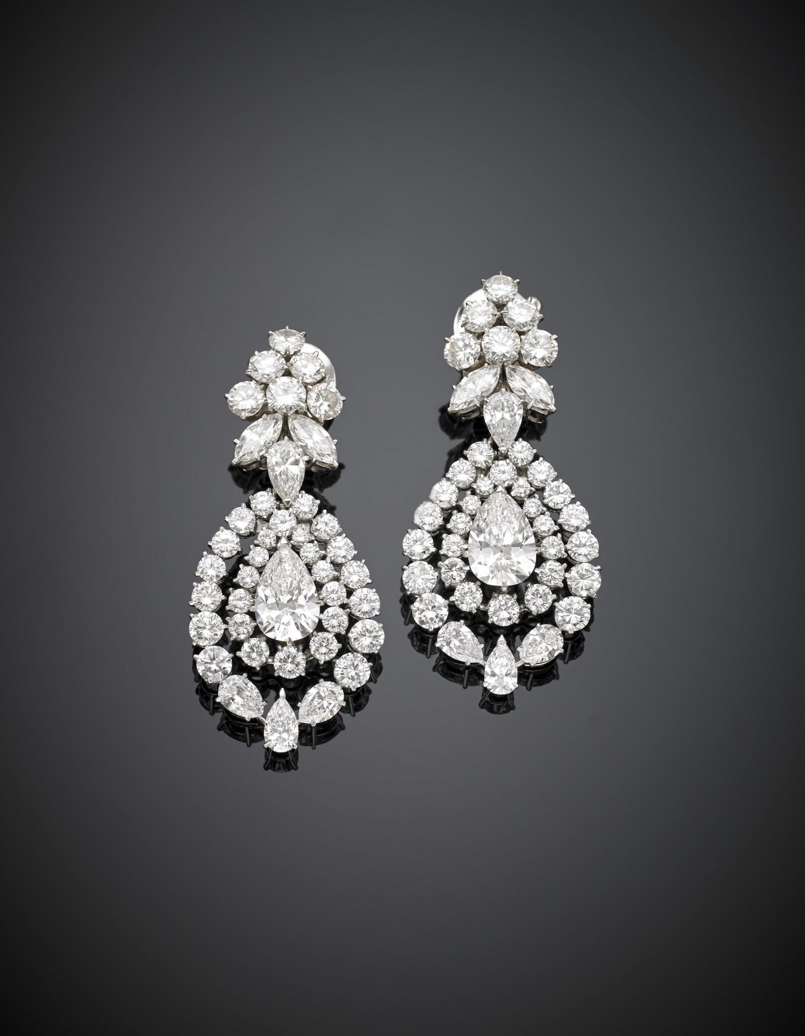 VAN CLEEF & ARPELS Orecchini pendenti in platino con pendente smontabile. I due orecchini sono composti da diamanti per complessivi ct 30 circa, dei quali due diamanti a goccia centrali rispettivamente di ct. 3,55 e 3,53, modello “Monaco” g 39,29, lungh. cm 6, largh. cm 2,5 circa. Punzonati per esteso VAN CLEEF & ARPELS, punzone della maison, numero 16376 SA, punzone OR per le clips, punzoni del platino e dell’oro francesi. Accompagnato da Certificato di vendita del 1973 a Ginevra in 12.Quai General Guisan Accompagnato da diamond report GIA n. 1192538755 e 1196538501 del 24/07/2018, New York
