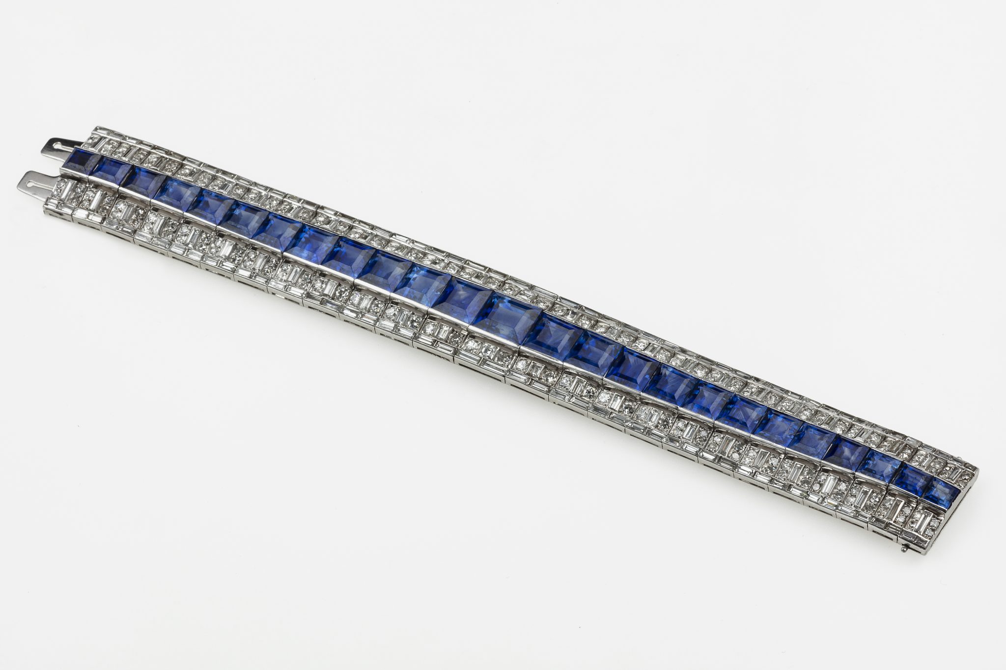 La copertina del catalogo è dedicata ad un bracciale in platino, con diamanti e zaffiri, unico per disegno e selezione delle gemme. Tra i lotti all’incanto si distinguono una pariglia di diamanti da oltre 6,50 ct l’uno, ideali per un paio di orecchini importanti, ed una fantastica collana di perle “naturali”, scalari, praticamente perfette e molto portabili: un investimento sicuro. Un bel diamante, taglio a goccia, di ct 3,05, colore F, corredato dal certificato gemmologia GIA NY.