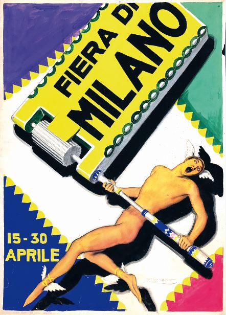 Molto particolare poi il manifesto di Achille Luciano Mauzan per la Fiera di Milano 15–30 Aprile, esempio dell’arte di Mauzan ai massimi livelli espressivi, mai banale e con lo sguardo perennemente bilanciato tra umorismo e suggestione pubblicitaria. Questo bozzetto non ebbe successo nella committenza e non risulta essere stato approvato per la stampa, ma è di grande valore e parte da una stima di 5.000-8.000 euro.