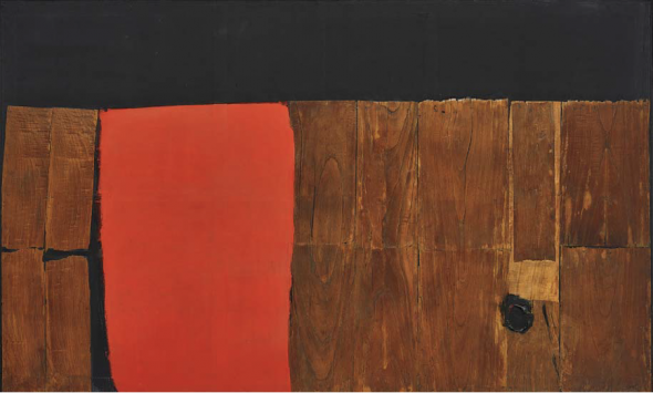 Di dimensioni monumentali (150 x 250 cm), il Grande legno e rosso vede la combinazione di legno e fuoco che Burri aveva introdotto solo poco tempo prima nella sua opera. La sua incorporazione di materiali “poveri” come il sacco e il legno era una testimonianza che un artista poteva elevare gli elementi più umili nel regno dell’arte, ponendoli su un piedistallo precedentemente impensabile. Burri stava spingendo i confini dell’arte verso nuovi estremi.