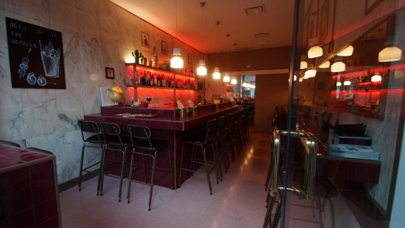 Un locale ispirato ai soda shop degli anni ’50: stile pop italiano, mood accogliente, chic e divertente. Elegante senza essere classico, vintage senza essere retrò, il bancone amaranto è realizzato con piastrelle artigianali fatte a mano e profilato in ottone con 23 sgabelli imbottiti. Ottone e amaranto sono i colori di Filz: tra i marmi del locale emerge una divertente parete cipria a pois amaranto firmata Le Corbusier. Divertenti oggetti da scoprire si specchiano nell’ottone del locale, solo un esempio: un distributore vintage di