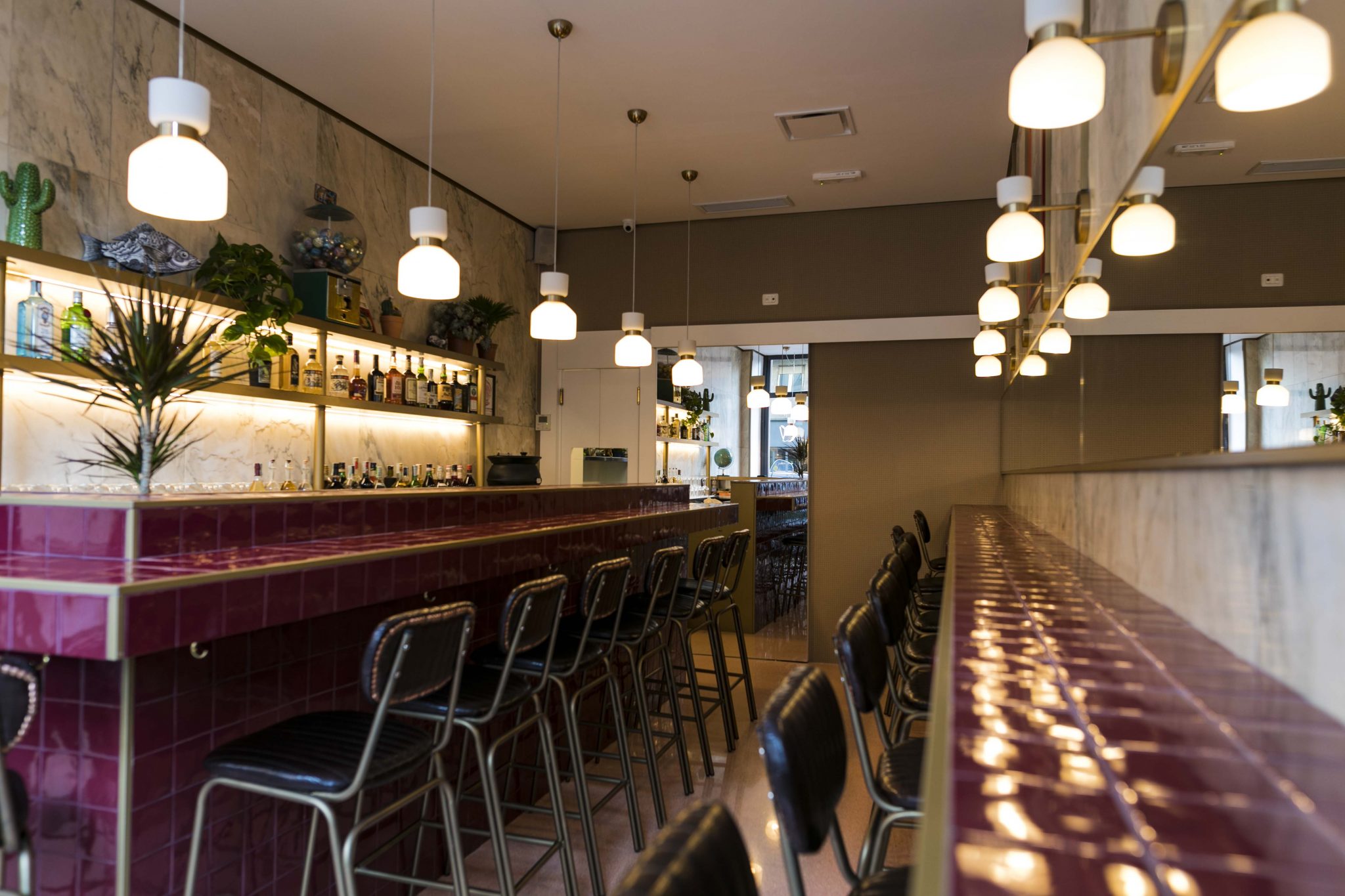 Un locale ispirato ai soda shop degli anni ’50: stile pop italiano, mood accogliente, chic e divertente. Elegante senza essere classico, vintage senza essere retrò, il bancone amaranto è realizzato con piastrelle artigianali fatte a mano e profilato in ottone con 23 sgabelli imbottiti. Ottone e amaranto sono i colori di Filz: tra i marmi del locale emerge una divertente parete cipria a pois amaranto firmata Le Corbusier. Divertenti oggetti da scoprire si specchiano nell’ottone del locale, solo un esempio: un distributore vintage di