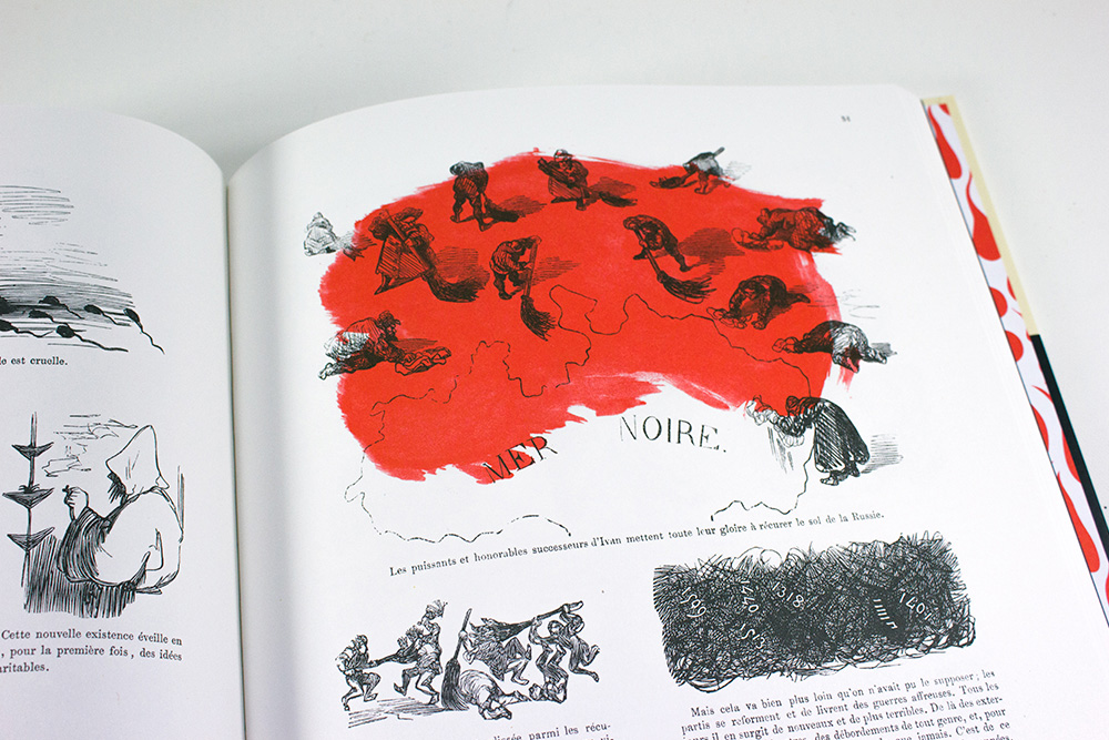 Gustave Doré ripercorre la storia della Russia dalla sua fondazione fino all’epoca degli Zar e si dimostra un narratore incredibilmente caustico e visionario: modernissimo. L’autore si fa beffe dalla storia e delle convenzioni, si rivolge al suo stesso lettore e mette alla berlina (bonariamente) anche il proprio editore, J. Bry Ainé – che lo sgridava per le illustrazioni troppo sconce- in un continuo gioco metanarrativo.