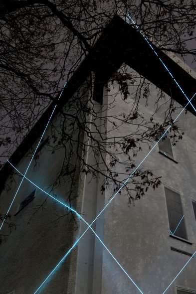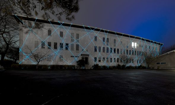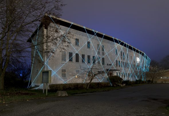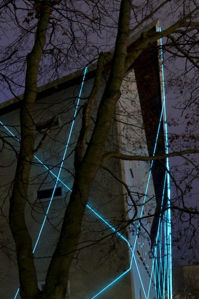Il duo artistico napoletano Bianco-Valente ridisegna la facciata del palazzo con una rete irregolare di cavi elettroluminescenti che formano decine di intrecci