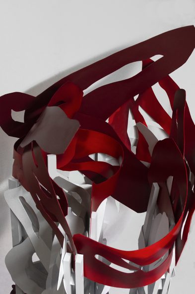 Classe 1984, Bartocci non può essere definito esclusivamente come urban artist. La sua produzione coinvolge, al pari del concetto di curiosità, uno sguardo a 360 gradi, sia in ambito di produzione materica, sia in ambito di commistione dei linguaggi e di marketing del prodotto. Non a caso per la sua micro-mostra all’interno del mimumo (micro museo monza) l’artista marchigiano, milanese d’adozione, presenta una scultura in legno e forex smaltato. Un omaggio alla figura femminile subito svelato dal titolo dell’opera Donna Forma 1 – Redshift Installation, posta in un luogo dove tutto appare al femminile, a