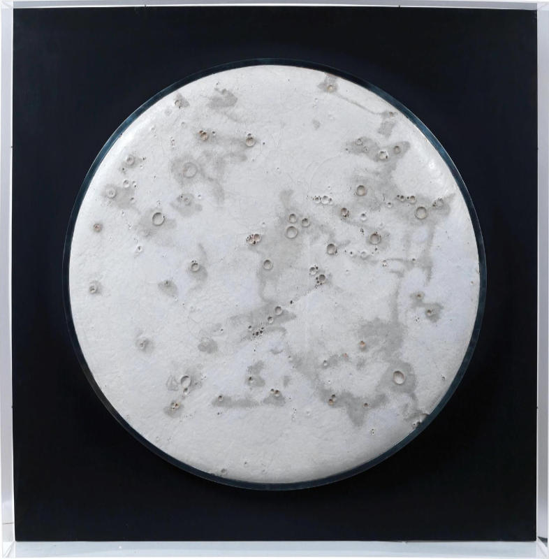 Superficie lunare, 1968, firmato Turcato, olio e tecnica mista su spugna applicata su tavola, diametro 90 cm, cornice originale e contenitore di perspex