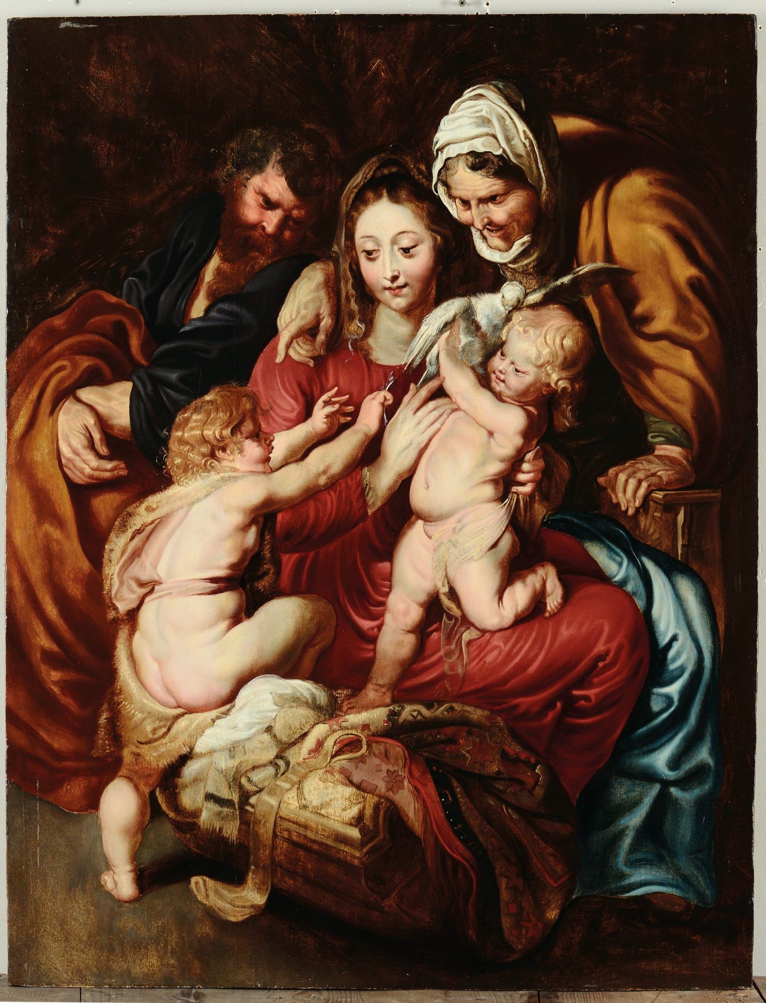 Divenuto formalmente “maestro” ad Anversa, Rubens non arrivava a Roma spaesato e alla ricerca di protezione: vi era stato mandato per lavoro, con uno scopo preciso da un signore, il Gonzaga, che lo avrebbe continuato a pagare e che solo l’anno successivo gli avrebbe chiesto di andare in Spagna. Fu con tutta probabilità proprio a Roma, nel suo primo soggiorno, che Rubens inizio’ a dar forma a quella tipologia iconografica completamente originale che e’ la “Sacra Famiglia con sant’Elisabetta, San Giovannino e la colomba”.