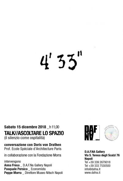 Sabato 15 dicembre 2018, alle ore 11:00, presso la D.A.F.NA Gallery a Napoli si terrà un talk con Doris von Drathen (prof Ecole Speciale d’Architecture Paris) in collaborazione con la Fondazione Morra. Intervengono Anna Fresa (D.A.F.NA Gallery a Napoli ), Pasquale Persico (economista) e Peppe Morra direttore museo Nitsch Napoli
