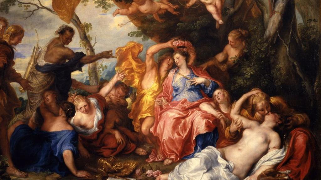 In mostra è dato spazio anche ad alcune prove mitologiche di Van Dyck, che trovano ispirazione nelle fonti letterarie più nobili o ricercate: così, dalle Metamorfosi di Ovidio nasce Vertumno e Pomona (Genova, Musei di Strada Nuova, c. 1630), dove non va trascurato di cogliere la bella natura morta nell’angolo in basso a sinistra, mentre dal Pastor Fido di Giovan Battista Guarini abbiamo il coreografico Amarilli e Mirtillo (Torino, Galleria Sabauda, 1631-32), memore dei Baccanali di Tiziano; e ancora, Teti nella fucina di Efesto (1630-32) del Kunsthistorisches Museum di Vienna, scena dell’Iliade, seconda versione del quadro di Potsdam. È poi esposta La continenza di Scipione (1627-28) della collezione di Angiolo Magnelli a Firenze, oggetto di una recente attribuzione a Van Dyck, in concorrenza con il quadro, iconograficamente paragonabile, del Christ Church College di Oxford.