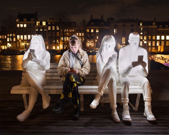 Il successo dell’installazione è presto spiegato: si tratta di un’opera d’arte in cui i veri protagonisti siamo tutti noi ripresi nella nostra quotidianità dove ormai il cellulare rappresenta un’estensione del nostro corpo e della nostra mente, assente dal contesto reale che la circonda. L’opera riprende infatti i volti illuminati di tre persone a grandezza naturale, seduti in una panchina con la tipica posizione che assumiamo ogni giorno al bar, durante le pause del lavoro, perfino a tavola: la testa china, lo sguardo fisso e il volto illuminato dal video del telefonino: un’immagine che diventa piuttosto inquietante quando fa buio.