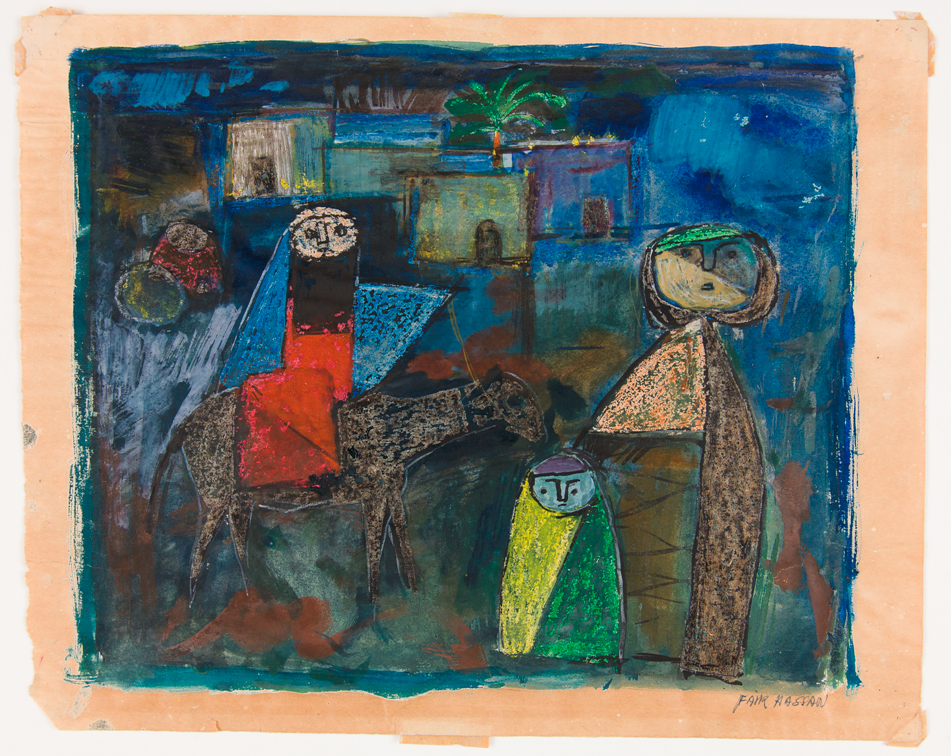 L’Islam appare sullo sfondo – quale elemento accessorio della quotidianità -, sottoforma, ad esempio, delle lunghe vesti nere femminili, o nella mezza luna che si inserisce all’interno del gioco di forme astratto. Ma non è una presenza ingombrante, lo dimostra il fatto che l’arte irachena ha anche larga dimestichezza con la figura umana.