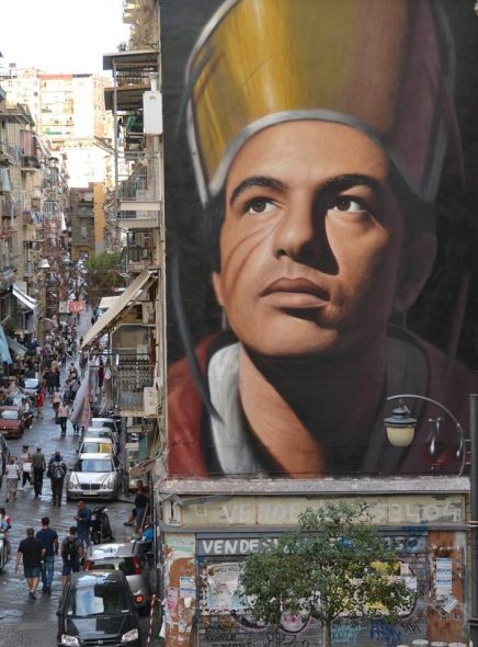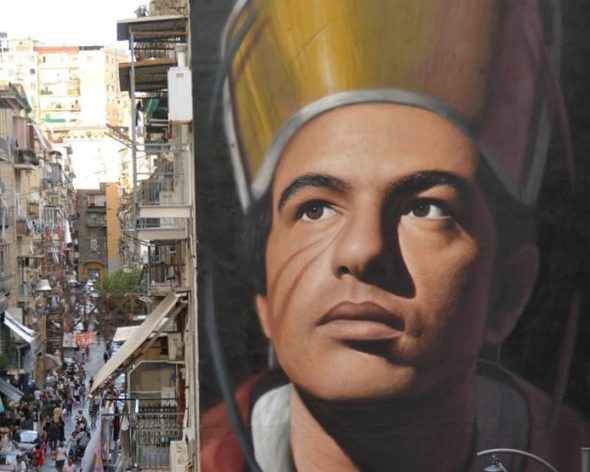 L’immagine recriminata è il suo ‘Gennaro’ (2015) , opera che raffigura il Santo più venerato di Napoli, nel centro storico della città partenopea, a pochi passi dal Duomo. Uno splendido murale alto più di 15 metri dove il santo viene raffigurato con il volto di un suo amico operaio di 35 anni, seguendo il modus operandi di Caravaggio, che sceglieva persone del popolo per raffigurare Santi e Madonne. Un’opera di Street art – in realtà l’artista di origini napoletane considera i suoi lavori veri e propri dipinti – che serviva a rilanciare il quartiere popolare di Forcella, perché il riscatto di un luogo non può mai prescindere dalla bellezza. Una delle tante opere di impegno sociale di Jorit che pochi mesi fa ha passato 24 ore di prigionia nelle carceri israeliane ( con tanto di foglio di via dal territorio israeliano di dieci anni) per aver raffigurato la giovane attivista Ahed Tamimi sulla barriera di separazione israeliana nei pressi di Betlemme.