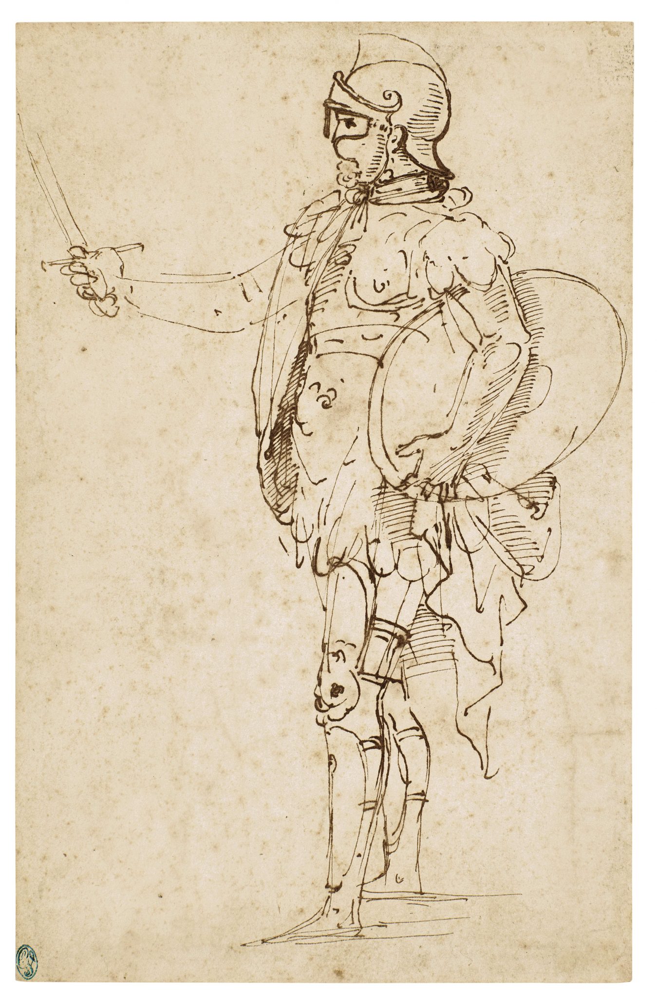 Un disegno fondamentale e da poco riscoperto di Raffaello, “Standing Figure in Armor” (stimato $800,000/1.2 milioni), è databile ai primi anni fiorentini dell’artista (1506-07 circa). Il disegno mostra tutta l’ imprevedibile originalità che caratterizza le opere di Raffaello di questo periodo. Servendosi solo di penna e inchiostro, l’artista disegna rapidamente un giovane soldato in piedi in armatura, con il braccio destro che tiene in mano una spada.