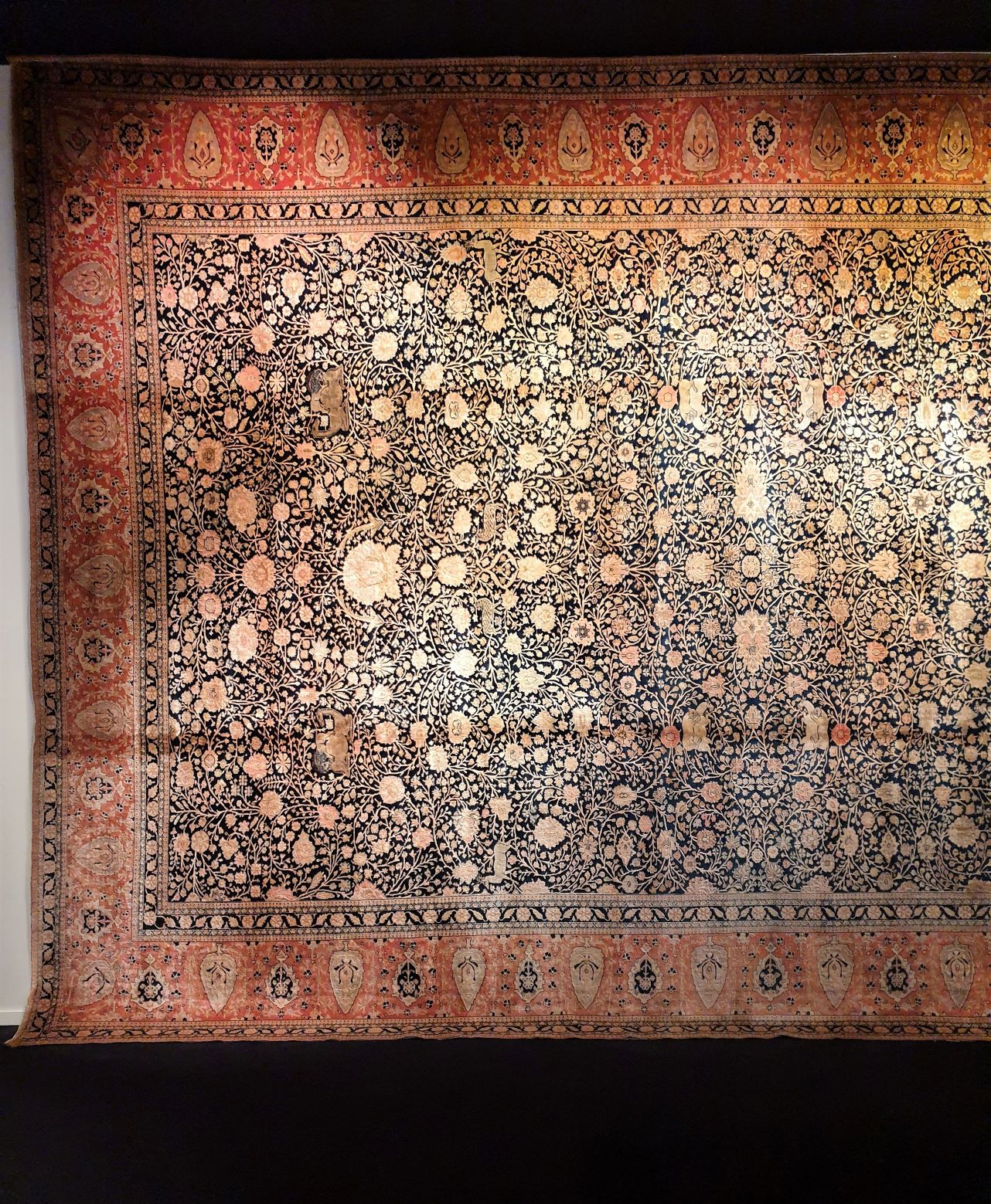 I maestosi tappeti di Vrouyr. Ne segnaliamo due in particolare, l’intreccio dicromatico persiano del 1880 (in foto) e la infinita spirale ellittica americana degli anni trenta