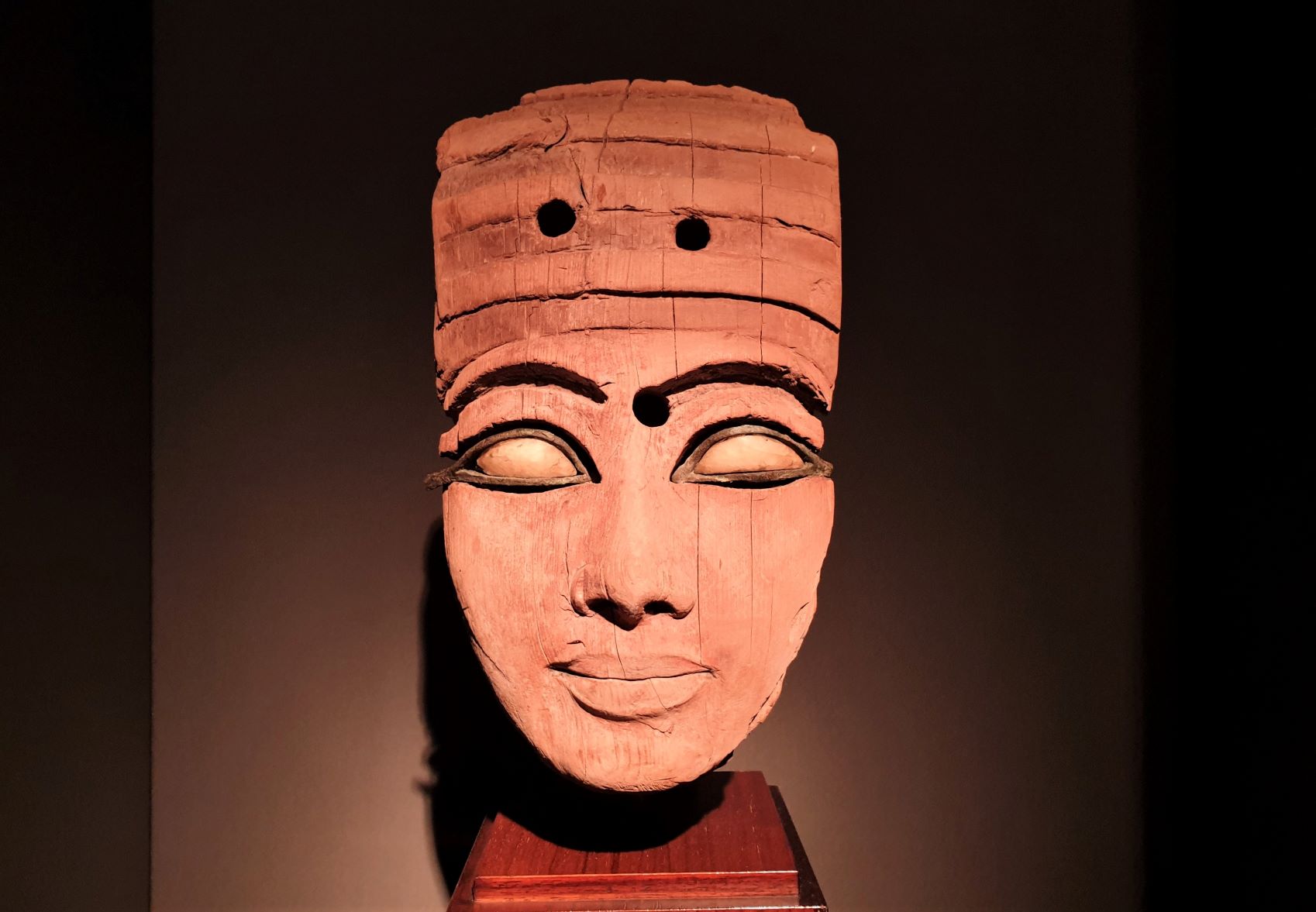 Legno, bronzo e marmo per questa sublime Maschera della 19° dinastia egizia (datata fine 1200 avanti cristo), da Cybele
