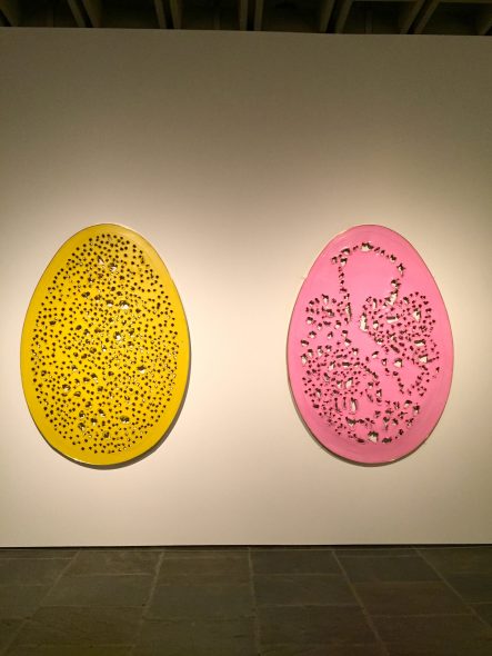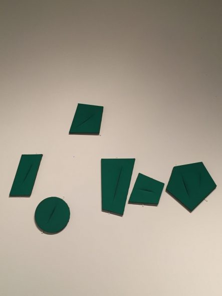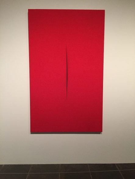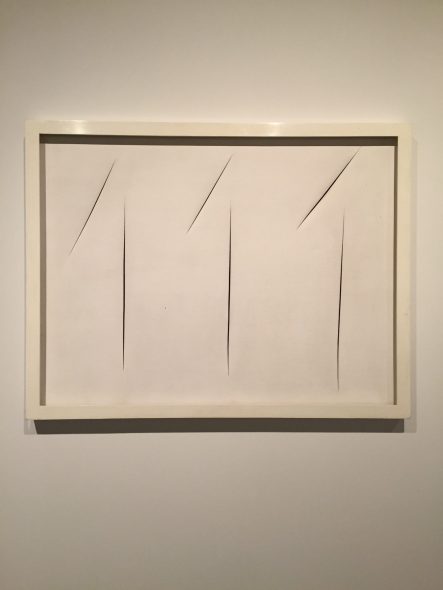 Aldilà dei popolari tagli monocromi, la mostra presenta infatti anche una vasta serie di sculture e in particolare della sue squisite ceramiche, soprattutto dal periodo di sperimentazione ad Albissola, a cui si aggiungono i suoi pionieristici ambienti (che già noi italiani abbiamo potuto scoprire l’anno scorso nella mostra all’Hangar Bicocca), così da contestualizzare quel radicale gesto dei suoi tagli all’interno di una più ampia ricerca sulla materia, la luce, lo spazio e l’energia, volta a integrare lo spazio dell’arte con lo spazio dello spettatore.