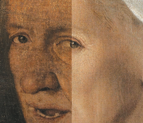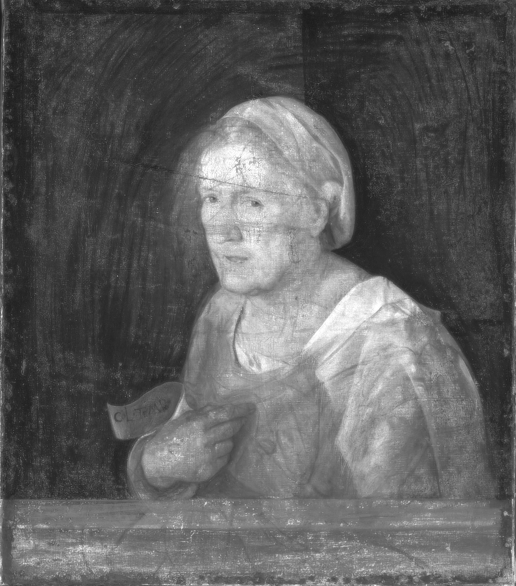 Conclusa la pulitura superficiale di asportazione dello sporco adeso si è proceduto, dopo aver eseguito i consueti test di solubilità, alla rimozione controllata della vernice alterata. La superficie pittorica era interessata da strati soprammessi di vernici caratterizzate da differenti composizioni e resistenza alla solubilizzazione. Alla luce della fragilità della pellicola pittorica originale, che rendeva necessario ridurre l’azione meccanica, si è optato per una procedura di asportazione selettiva ma in un unico passaggio e, per ridurre la permeazione del solvente, si è utilizzata una miscela addensata, riducendo la concentrazione dei solventi mediante preliminari micro-test comparativi in molteplici formulazioni. Ultimata la pulitura è stata eseguita una verniciatura intermedia a pennello e quindi la stuccatura delle poche lacune. Il ritocco è proceduto con l’obiettivo di restituire leggibilità al dipinto mantenendo la percezione delle sue condizioni conservative. Le abrasioni degli incarnati e quelle bianche dello scialle e copricapo sono state “abbassate di tono”. Dove la tela di supporto emergeva è stata mantenuta a vista e intonata al colore circostante. Ridotto localmente, in modo selettivo, l’impatto della crettatura per favorire l’emergere dello strato pittorico originale. Trattate in questo modo in particolare la fronte, la guancia sinistra attorno all’occhio, alcune aree dello scialle e del copricapo de La Vecchia. Minutamente ridotto l’effetto disturbante del taglio diagonale nella fronte. Le abrasioni diffuse del fondo nero sono state abbassate in modo da essere assorbite dalla tonalità della campitura originale, mentre si sono lasciate maggiormente visibili le pennellate nere dell’abbozzo. Infine il parapetto, molto abraso dalla pulitura meccanica eseguita da Pellicioli è stato ricucito con micro-velature trasparenti.