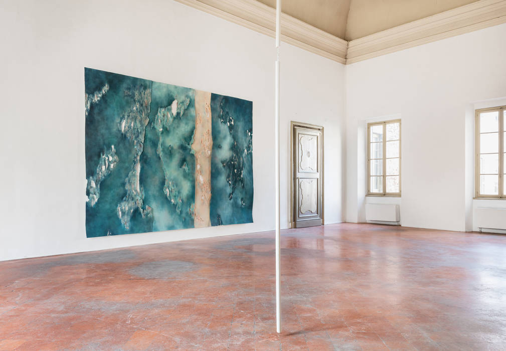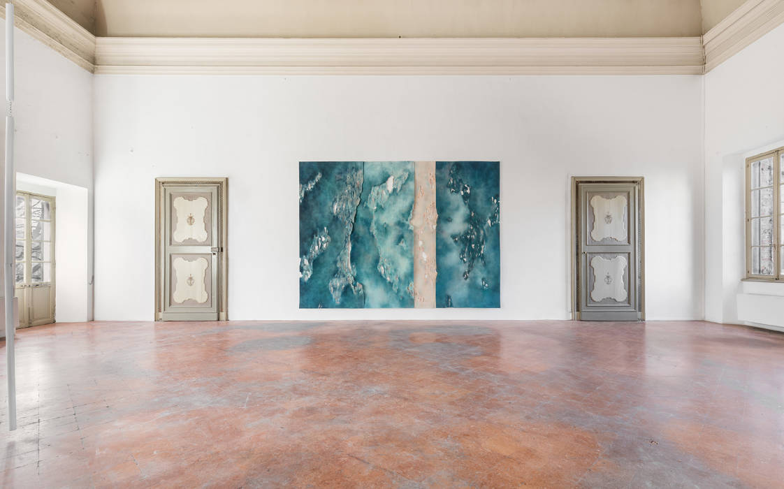 L’esposizione si scandisce in tre episodi narrativi. Tre come sono i saloni cinquecenteschi in cui si collocano le opere, che l’artista ha ideato pensando proprio alla specificità delle tenui nuancesdelle pareti e al sapore di storia che avvolge la galleria. Due invece sono i viatici espressivi che le sono parsi più congeniali per dialogare con gli ambienti: pittura e scultura. Si comincia con la seconda, ed ecco che al cospetto del visitatore si materializza subito Hold. Dal soffitto cassettonato in legno discendono due linee rette di gesso bianco inframezzato a tratti in cui si scopre una catena metallica che fa da ossatura a questa scultura-installazione impercettibilmente oscillante. Una sorta di meridiana, verrebbe da definirla, o un sottile dispositivo temporale: con i due vettori dall’aria astratta che disegnano, arrestandosi a pochi centimetri dal pavimento, ombre mutevoli nell’arco della giornata.