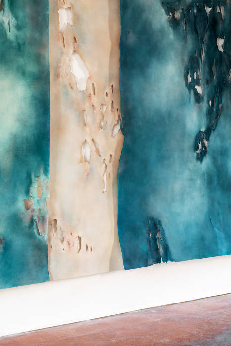 Nella sala successiva la mostra raggiunge il suo climax. Accanto a Keep, che riprende la sintesi scultorea della linea verticale già espressa con Holdnell’ambiente precedente, appare l’opera che dà il titolo all’intera esposizione, Stay, enorme arazzo pittorico su carta nel quale Buandispiega un universo emotivo sotto forma di puro colore. Verdi oceanici e una striscia color terra che però, man mano ci si avvicina, si rivelano increspati da strappi, screpolature, erosioni. Quella superficie che a un primo sguardo suggerisce esuberanza vitale risultaquindi in uno stato di deterioramento. Ed è la stessa artista a procurare questo processo di “invecchiamento” forzato, e lo fa manipolando la sua stessa opera a costo di sgretolarla.
