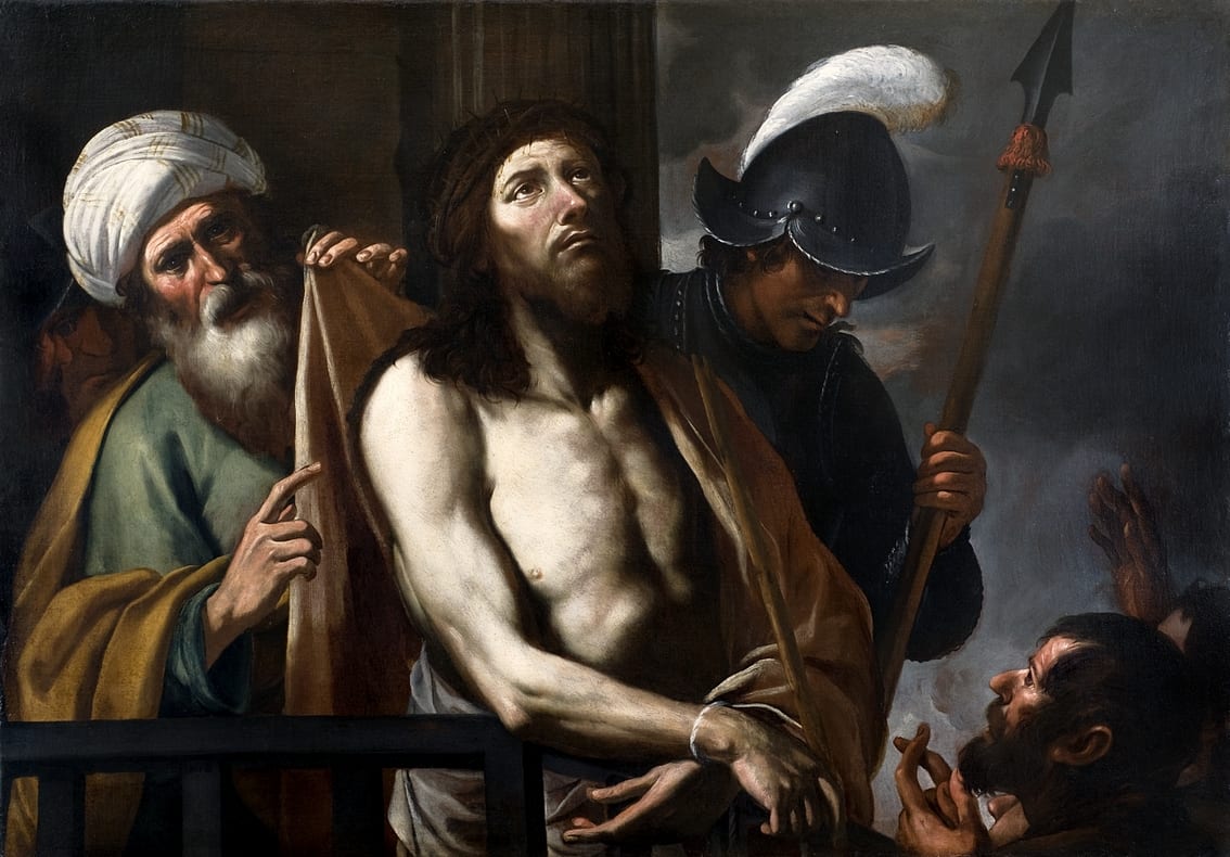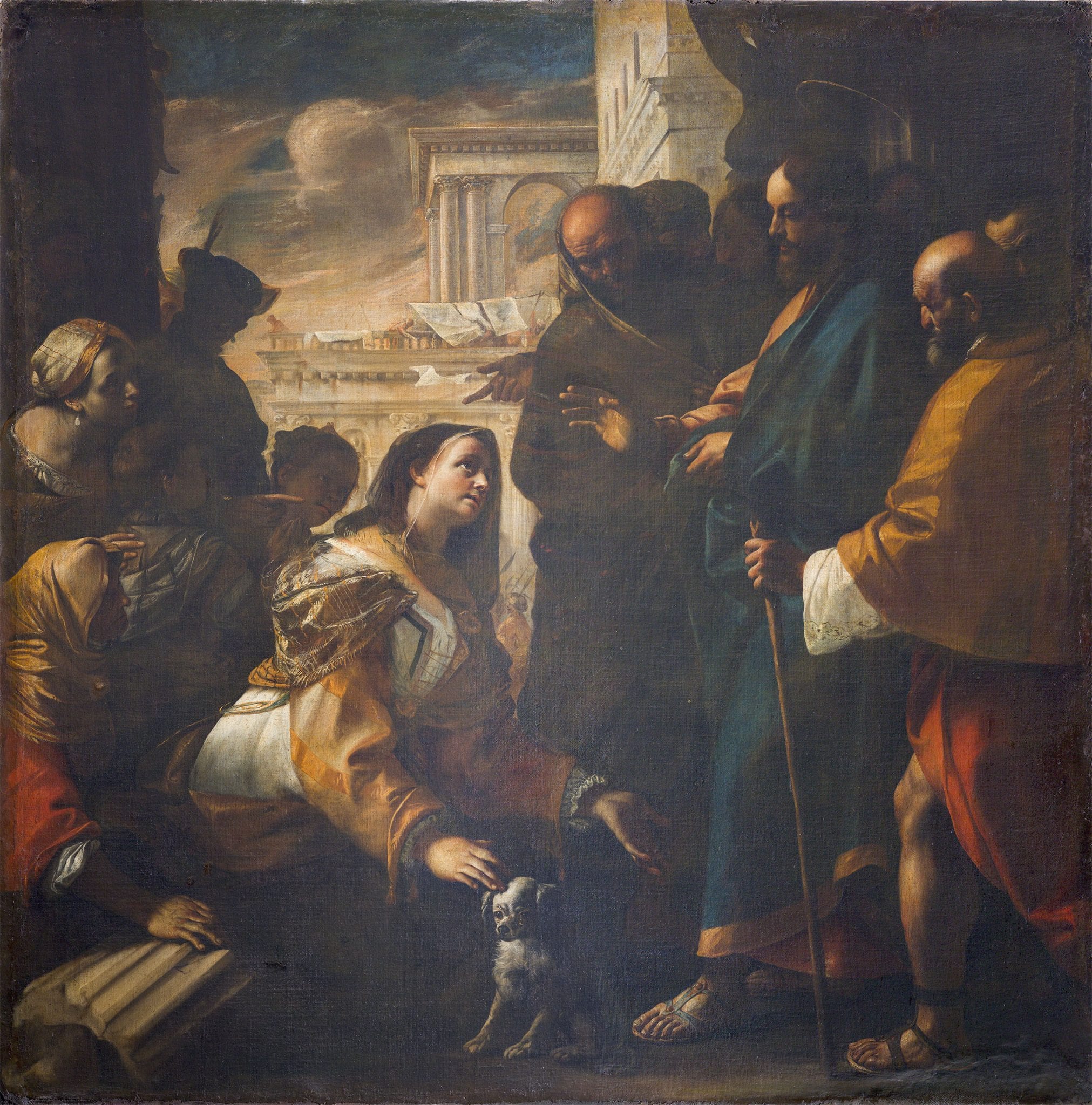 La composizione del testo pittorico, felicemente riportato a nuova e più chiara leggibilità, si presenta ovunque densa di figure ed un colore pregiato – il blu lapislazzuli – la percorre tutta, come a segnare un ritmo, una cadenza cromatica che accompagni morbidamente lo sguardo: dalla manica del liutista al bordo sinistro alla tunica del chitarrista; dai polsini del giocatore di morra alla tunica del filosofo di Abdera. L’occhio si posa su un altro grande olio, Cristo e la Cananea, che apprendiamo essere più o meno coevo del precedente (1646-479), realizzato però dal solo Mattia. Anche se gli anni, in verità, se li porta maluccio a causa della sporcizia e dell’ossidazione delle vernici che gli conferisce una certa aria tenebrosa. Come ci spiega Primarosa, si tratta di uno dei primi grandi capolavori di Mattia Preti, un’opera dichiaratamente neoveneta e insieme guercinesca, lanfranchiana e in qualche misura ancora caravaggesca: l’artista vi sintetizza, insomma, tutti i suoi punti di riferimento.