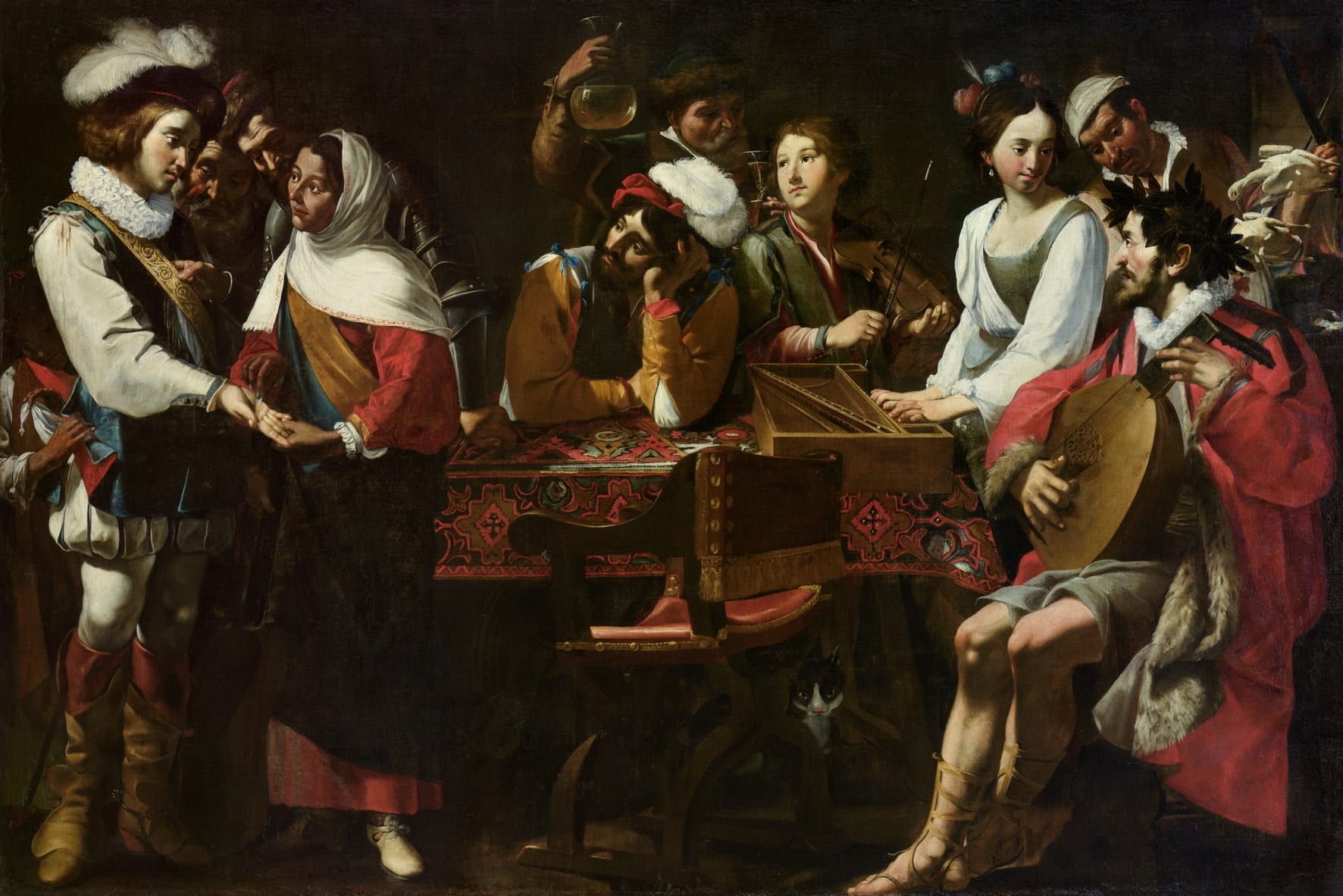 Il dipinto impagina una sequenza di scene di taverna – un genere di chiara ispirazione caravaggesca – interpretata come un’allegoria a sfondo didascalico della vacua malìa dell’appetizione sensoriale: Il concerto (udito), la mescita del vino (gusto), il fumatore di pipa (olfatto), la chiromanzia (tatto) mentre la vista è allusa dall’autoritratto di Gregorio che scruta attento il riguardante. Alla mimica espressiva dei due filosofi – Eraclito piangente e Democrito gaudente – collocati all’estremità destra della tela, è demandato icasticamente il monito sulla natura ingannevole dei sensi. Come sottolineato dai curatori, Alessandro Cosma e Yuri Primarosa, la Roma in cui i Preti si trovarono ad operare, era un caleidoscopio di stimoli e di esperienze: dagli epigoni del caravaggismo – segnatamente Jusepe de Ribera – al barocco del Guercino e di Lanfranco, alla pittura neoveneta ispirata a Tintoretto e a Veronese. La mostra si sviluppa in due sale. Accanto al dipinto protagonista, altre undici opere la completano a documentare sommariamente la stagione romana dei due fratelli. Ma soffermiamoci ancora sull’Allegoria dei cinque sensi.
