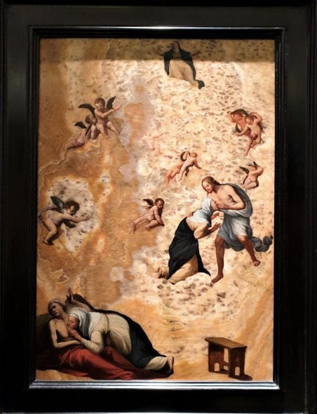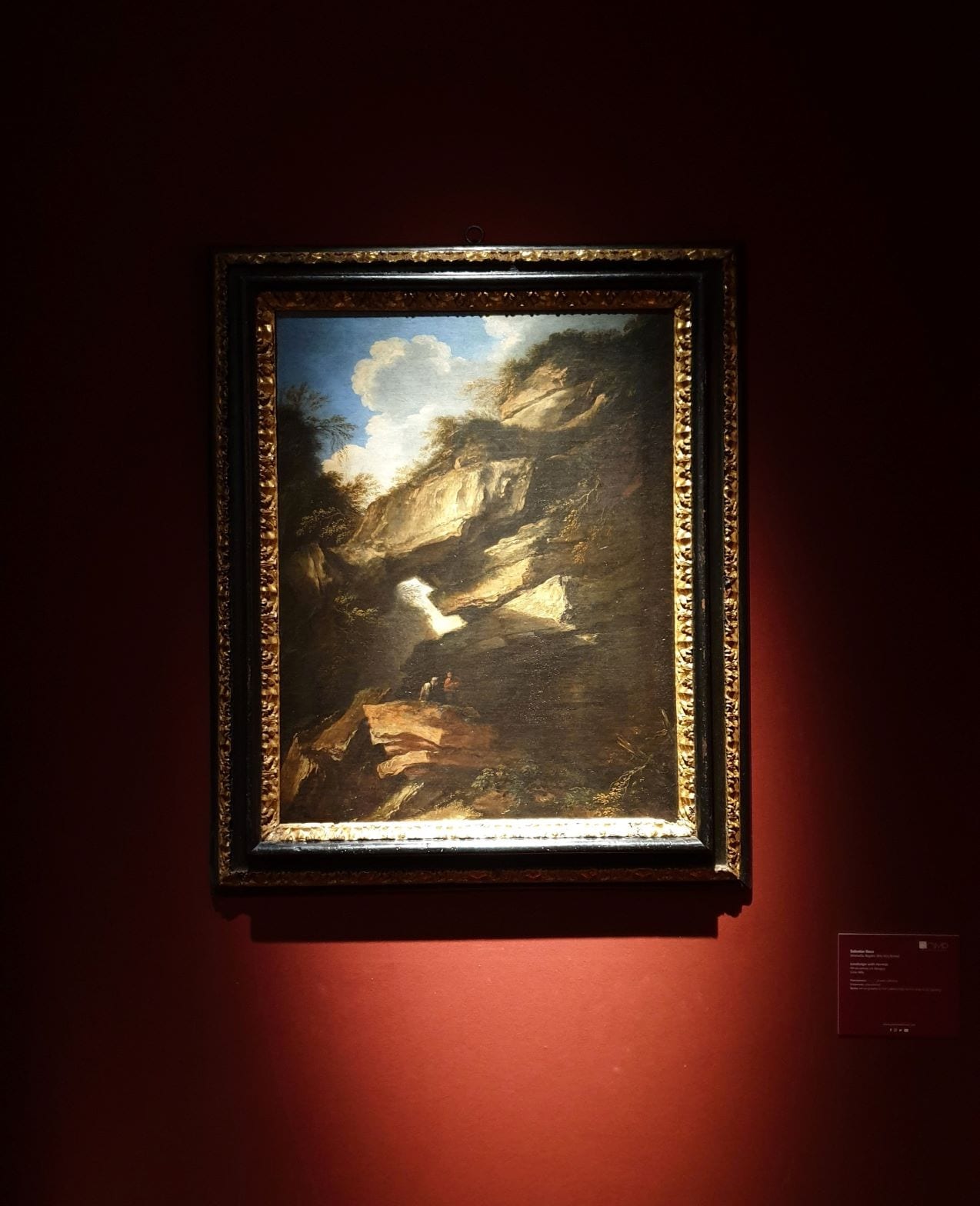 I meravigliosi “difetti” dell’alabastro egiziano fungono da nuvole per i putti che adornano la Vita di Santa Caterina di Siena (attribuita a Saraceni, 1600 ca). Opera di piccolo formato che campeggia all’ingresso dello stand di Giacometti. Dalla scena celestiale, ci si perde tra il porpora delle pareti popolate da significative tele del Seicento (come quella di Luca da Reggio), giungendo a un grazioso paesaggio minerale di Salvator Rosa, eccelsa chiosa di un secolo.