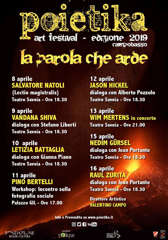 A Campobasso giunge alla quinta edizione il Poietika Art Festival, kermesse che dall’8 al 16 aprile ospiterà in Molise scrittori, fotografi, economisti, musicisti e poeti interrogandosi sul tema “La parola che arde”. Dopo quattro edizioni in cui la parola è stata declinata nelle sue varie sfaccettature artistiche e con ospiti straordinari (Adonis, Umberto Galimberti, Pupi Avati, Tahar Ben Jelloun, Jorge Galan, Antonio Moresco, Ibrahim Nasrallah, Vito Mancuso, Valerio Magrelli, Mariangela Gualtieri, Milo De Angelis, Patrizia Valduga, Ian Goldin, Steve McCurry, Cristiano Godano, Emidio Clementi e tanti altri), l’appuntamento del 2019 ribadisce la scelta di campo e la visione della cultura intesa come veicolo di denuncia, di testimonianza anche scottante e scomoda, per niente rassicurante.