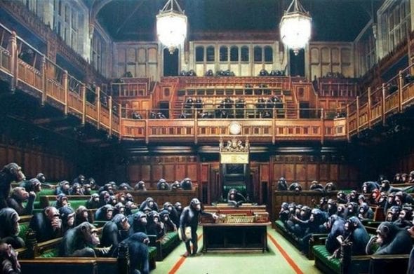 In occasione del(l’imbarazzante) voto andato in scena ieri nel corso delle votazioni finali sulla Brexit, risolto ancora una volta con un nulla di fatto, il Museum & Art Gallery di Bristol ha esposto un vecchio lavoro di Banksy , il “Devolved Parliament“, un parlamento di scimpanzé creato dieci anni fa e riproposto proprio in occasione del decennale della famosa esibizione ‘Banksy vs. Bristol’, una rassegna che aveva riscosso un grande successo.