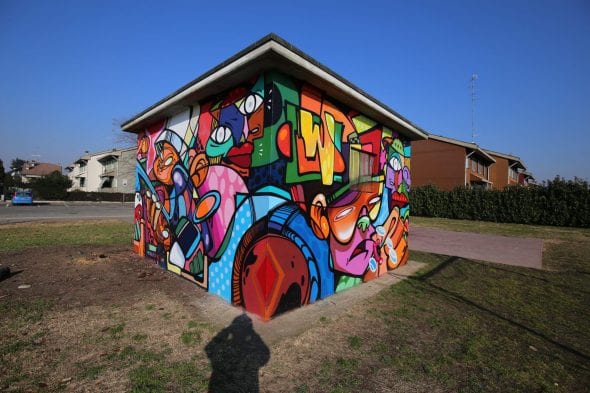 Prima di esprimerlo nell’arte lo esprimo nella vita, comportandomi come ritendo sia corretto fare ed insegnandolo a mio figlio. Queste sono le prime due cose che faccio. Poi nell’arte non ho mai avuto la vera esigenza di dirlo ma perché per me, ripeto, sono un artista molto spontaneo, per me è naturale non essere razzista o omofobo. Quindi non sento la necessità di doverlo dire più di tanto. Il mio mondo è un mondo un po’ diverso, è un mondo surrealista, pop surrealista che ha un forte backgroud nel writing e nella street art ma soprattutto nella cultura hip hop, quindi non sono argomenti che tratto normalmente però per esempio, quando ho fatto il workshop al liceo artistico di Viale Padova ai ragazzi ho fatto realizzare un tema multi etnico che abbiamo realizzato sui muri. Ci sono queste 2 mani che si stringono fatte di bandiere e di icone di diverse culture e questo è l’insegnamento che riesco a dare nell’arte cioè farlo fare a loro, perché per quel che mi riguarda in questo momento non sento questa esigenza che diciamolo è anche un po’ trandy. Quando mi sentirò di farlo, lo facrò probabilmente.