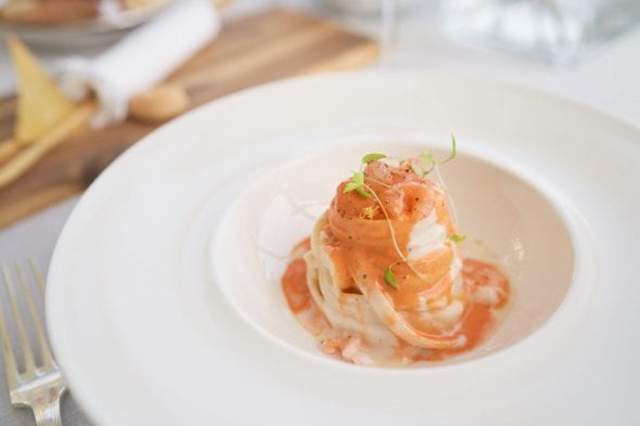 Pressoché inutile il taccuino, vivissime le ricordanze di cena di inizio primavera, il mare dabbasso a fare da quinta insieme con cielo provvidenzialmente stellato. La luna di suo, a celebrarsi come l’astro d’argento. Si comincia con tonno all’arancia su cui le persone di sala, servizio top quality, versano un saporito, non invadente, consommé di soia. Forma fenomenica di tagliatella a “cosa” che pasta non è! Difatti trattasi di tagliatellina di seppie con avocado, limone salato e cetriolo. Ci piace immaginare l’empito dello chef e della sua valente brigata nell’addivenire al fine tuning di questo piatto squisito, laddove tanto si gioca sui contrappunti di gusto tra note acidule, note salate ed una sottile trama dolce. A seguire, tagliatelline che. . .tali sono ! Sì, pressoché perfette, ecco le tagliatelline di semola di grano duro cacio, pepe e gamberetti di nassa al profumo di limone. Il famoso limone sfusato amalfitano, che si fregia di sua IGP.