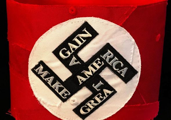“Incitamento all’odio”: per questo Facebook ha sospeso l’account dell’artista che aveva riformulato lo slogan presidenziale piazzandolo su una svastica e su un cappuccio del Ku Klux Klan