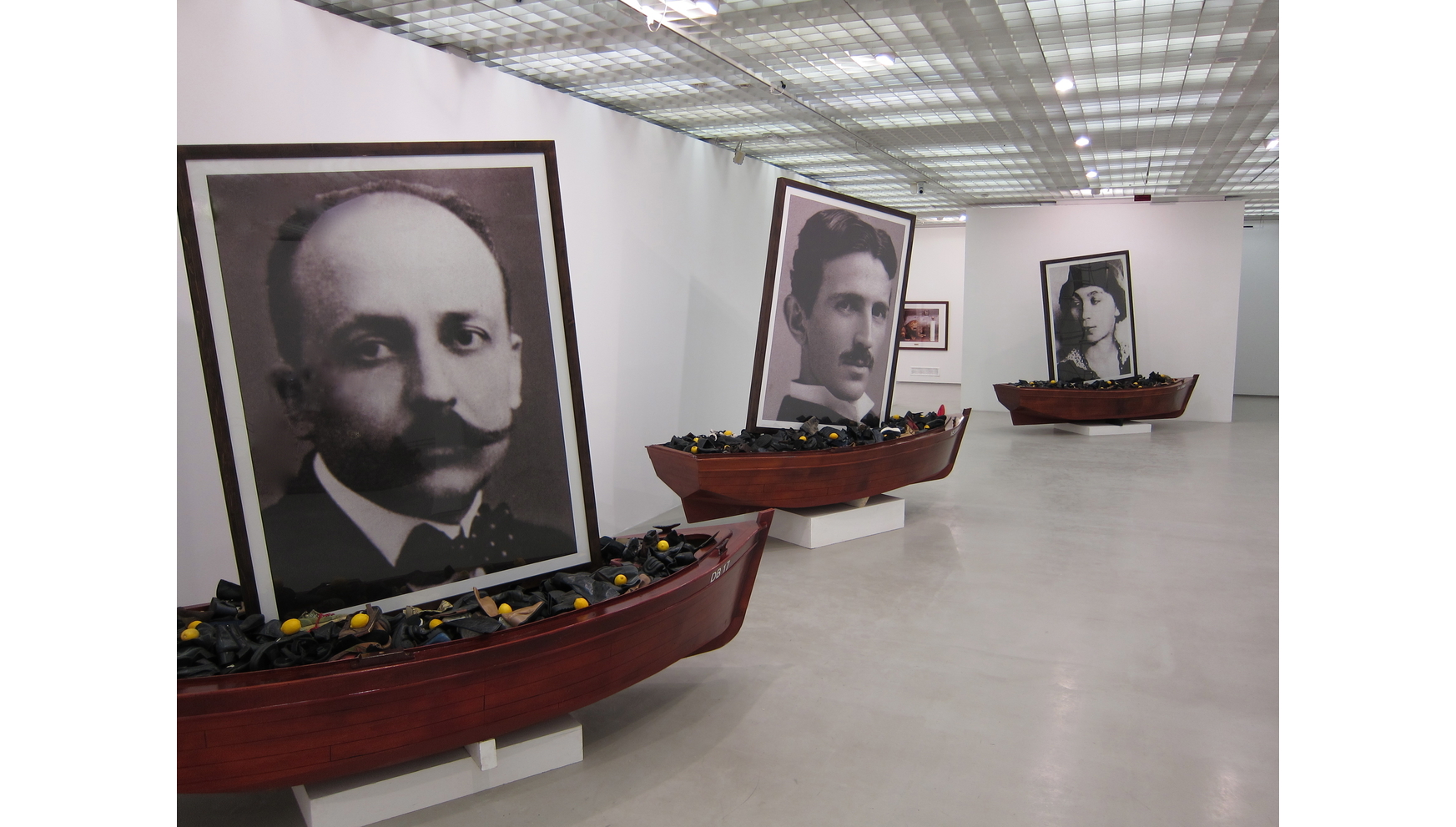 La mostra prende inizio con un’imponente installazione che vede protagoniste due barche le cui vele ritraggono i volti di artisti ed intellettuali quali Tesla, Modigliani, Malevic e Goncharova, accomunati da vicende critiche alternanti e che hanno visto la propria fama essere riconosciuta solo molti anni dopo aver prodotto le opere per cui sono considerati dei maestri. Il percorso prosegue nella seconda sala dove l’attenzione si sposta su altre due serie di lavori dell’artista bosniaco articolate intorno alla grande installazione Heralds of Post History, già presente in Arts and Foods organizzata da Germano Celant presso la Trenniale di Milano in occasione di Expo 2015. Le fotografie appartenenti alla serie Balkan Walzer ritraggono i volti di famosi compositori “sfregiati” da dei picconi i quali rompono la superficie del vetro e rimangono incastonati nell’opera insieme ad un peperoncino rosso a rievocare un rivolo di sangue.