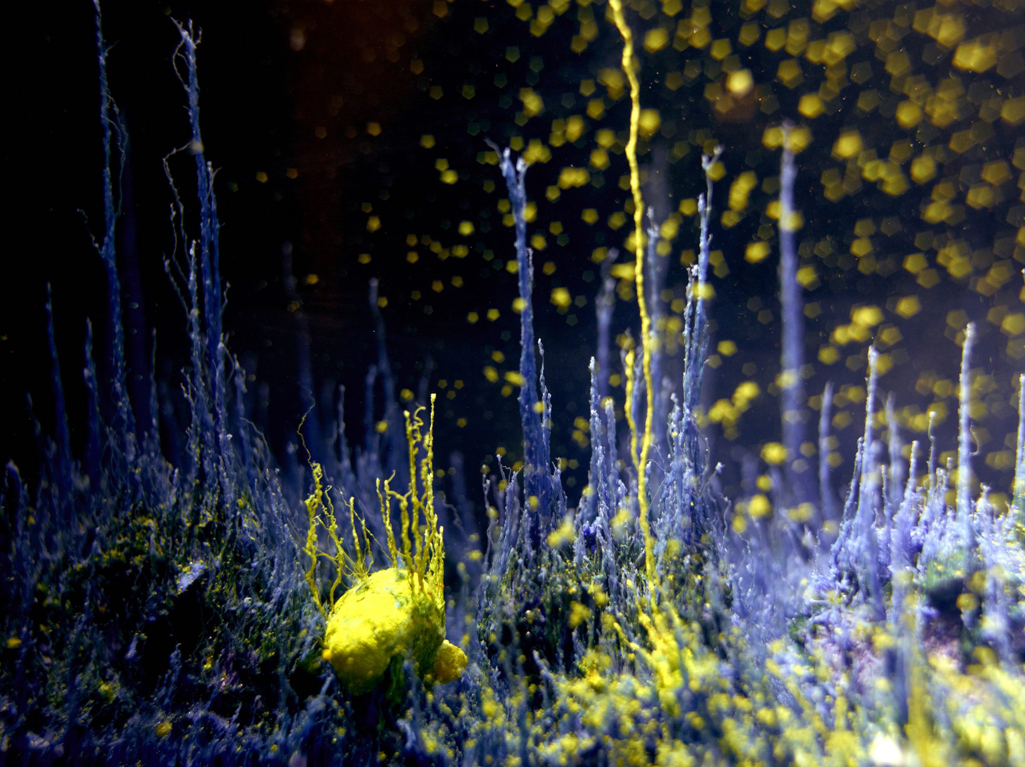 La serie “Presage” pone nuova luce sulla materia inorganica, generalmente intesa come statica e immutevole poiché caratterizzata da tempi evolutivi estremamente diversi da quelli dell’essere umano, mostrando invece le trasformazioni repentinegenerate dalle interazioni con alcune sostanze specifiche. Il mondo minerale assume quindi delle prerogative considerate proprie dei sistemi viventi in una dimensione che non risponde alle tradizionali leggi della fisica e invita così l’osservatore a sviluppare percorsi immaginifici, sperimentando la presenza inedita delle energie e delle forze scaturite dalla materia.