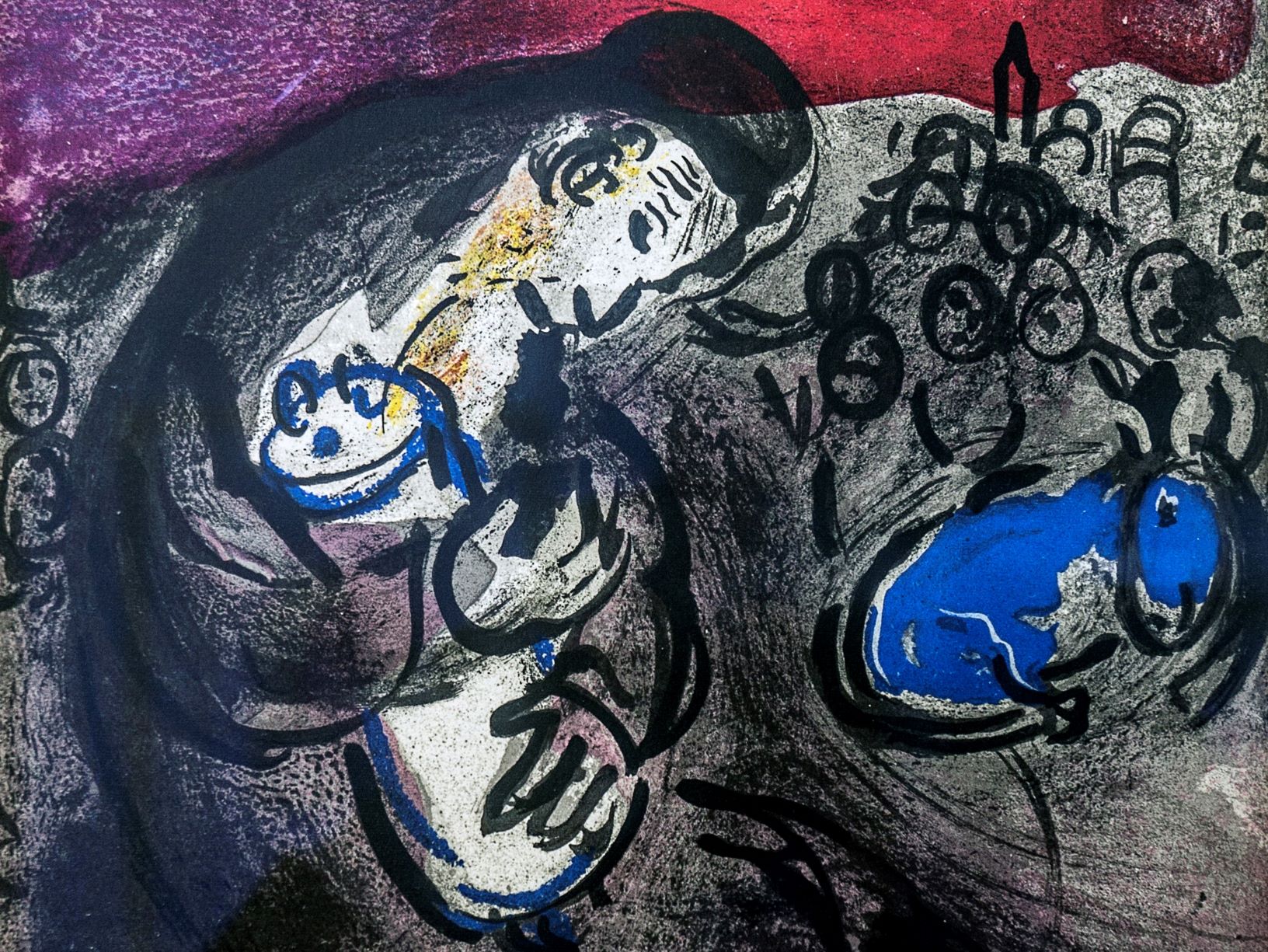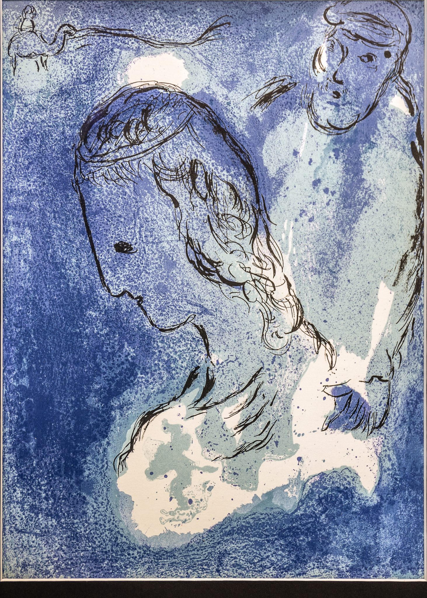 Eppure c’è una nota diversa in queste opere rispetto alle precedenti dell’artista, è rappresentata, infatti, una sorta di serietà. L’artista non lascia che le figure, pur astratte, fluttuino nello spazio, ma le rende più ferme, salde a terra. Le illustrazioni assumono una connotazione quasi fotografica, o meglio, è come se Chagall avesse voluto fotografare i momenti descritti dalle immagini e lo avesse fatto cogliendo i protagonisti dei racconti sacri proprio nel cuore dell’azione con mezzi busti, figure tagliate o primissimi piani impossibili da racchiudere in una posa statica. Per fare qualche esempio, in “Mosè con le tavole della legge” e in “Mosè con le tavole della legge davanti al popolo” i fasci luminosi che fuoriescono dalla fronte del profeta sono appena un accenno (proseguono, certo, oltre l’immagine nella fantasia dell’osservatore); o ancora in “Angelo”, Chagall stilizza un volto angelico, mentre le ali (forse troppo grandi) entrano solo in parte nello sfondo della litografia.