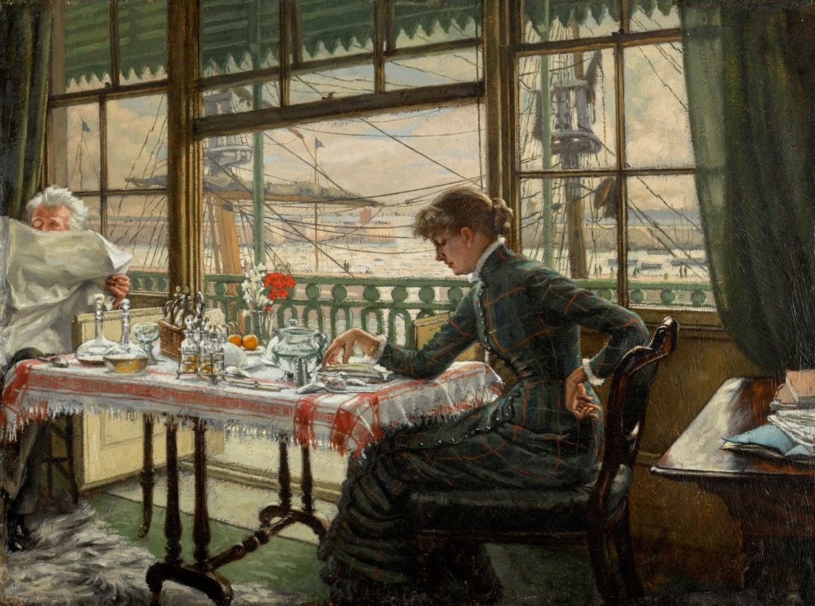 In una calda giornata estiva, nella sala da pranzo di un hotel sul mare, una giovane donna è seduta a leggere e godersi la fresca brezza dell’oceano attraverso la finestra aperta. Il tavolo è apparecchiato per un pranzo leggero, ma né lei né il suo vecchio accompagnatore sembrano interessati a mangiare. Sono assorti nelle loro attività, nel libro e nel giornale, noncuranti di tutto quello che accade attorno a loro. La giovane è vestita in modo sontuoso, ma austero, avvolta in un abito in tartan verde abbottonato fino al collo e lungo fino alle caviglie. I suoi capelli sono ordinatamente raccolti e non mostra gioielli visibili, se non un semplice braccialetto d’oro.