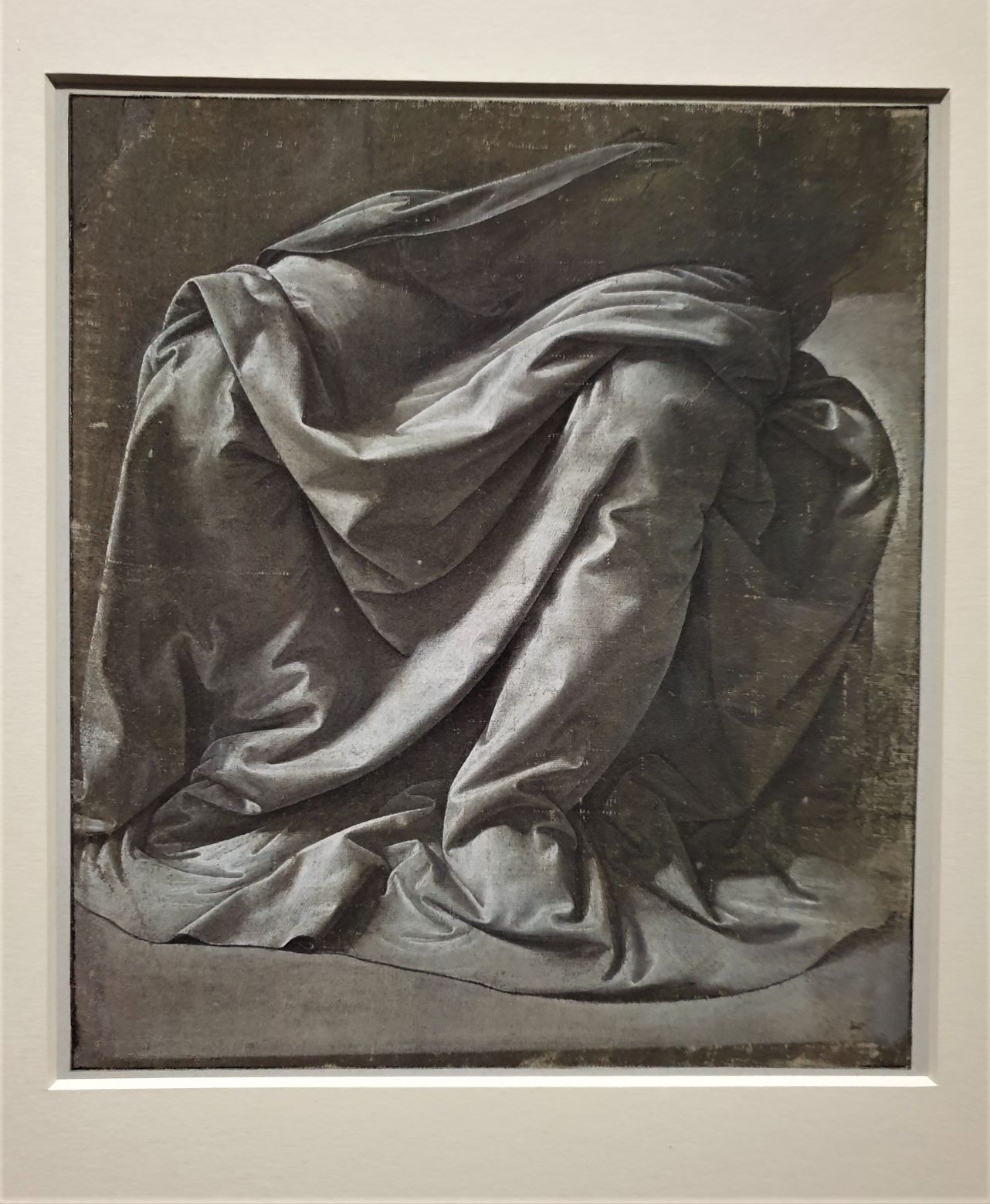 – i confronti e i dialoghi (i busti e le effigi marmoree di eroi e eroine, le movenze, le pose, le mani… scolpite da Verrocchio, disegnate da Leonardo in punta d’argento e punta di piombo come recita la prima sala), le “sfilate” (mirabile quella che contrappone pittura e scultura sul tema della Madonna con Bambino), e le sezioni, come quella dedicata al “panneggio”, quel “piegar de’ panni” nel quale si sfidarono Leonardo e Verrocchio a catturare su tele di lino l’effetto della luce sui panni, simulato con stoffe bagnate plasmate su manichini;