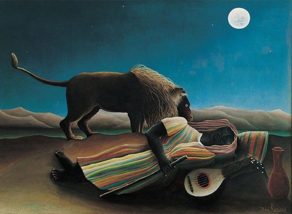 E per quanto riguarda lo stile onirico di Rousseau basta ricordare un’opera come “The dream” anch’essa esposta al MoMA, dove possiamo vedere raffigurata una donna con accanto degli enormi fiori della grandezza di un corpo umano, oltre a due mansueti leoni dal volto buffo, rappresentati ironicamente più come simpatici gattini che come due belve feroci.