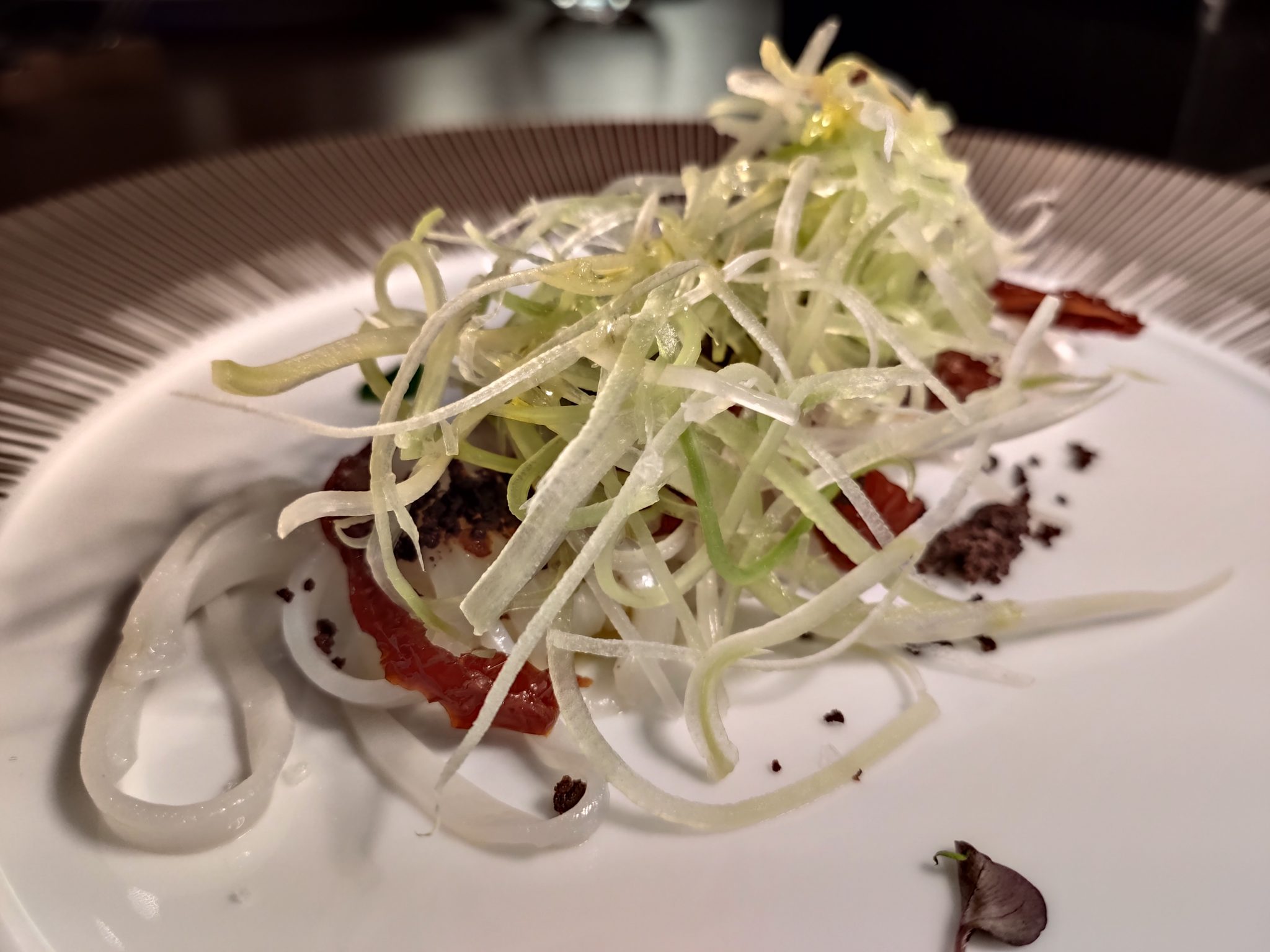 “Questo mix insegue più di una tendenza,” ha commentato Barberis, “perché ha l’intento di tirar fuori e sottolineare le classi di aromi già presenti nel Monkey 47: sentirete un filone orientale particolarmente speziato, poi un tedesco dato dai frutti di bosco, e infine il classico agrumato. La cremosità data dalla spuma di meringa ingentilisce il tutto.” Quasi geniale, diremmo, grazie anche ad una nota lieve di abboccato che non si sovrappone al resto e si mette al servizio della delicatezza, marina ed agreste, pensata dal duo Ribaldone-Rinaldi: calamaro a striscioline, sedano ghiaccio, tapenade di olive nere, pomodorini secchi.