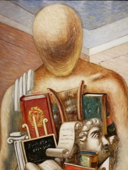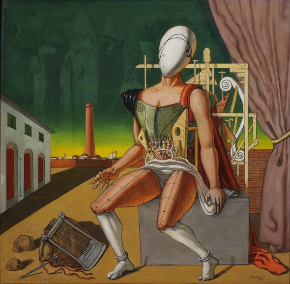 Quindi la parola chiave diviene mistero e, insieme ad esso, la curiosità di svelarlo. Del resto l’enigma è linfa principale delle opere del pittore nativo di Volos, Grecia, che intravide nella modernità un grumo di ombre impossibili da disperdere. La sua arte è divenuta così luogo ideale dove riversare visioni (e non sogni, cari al Surrealismo) che fungessero da porte, appena socchiuse, per dimensioni all’apparenza reali ma, ad una visione più attenta, intimamente irrealizzabili. É stato il segreto di de Chirico – l’incantesimo con cui ha acceso i suoi quadri di una diffusa sospensione, di un’azione sul punto di essere, di un segreto in svelamento -, quello di costruire scene attingendo dal concreto per poi decontestualizzarle.