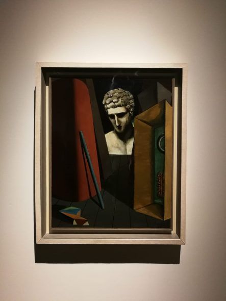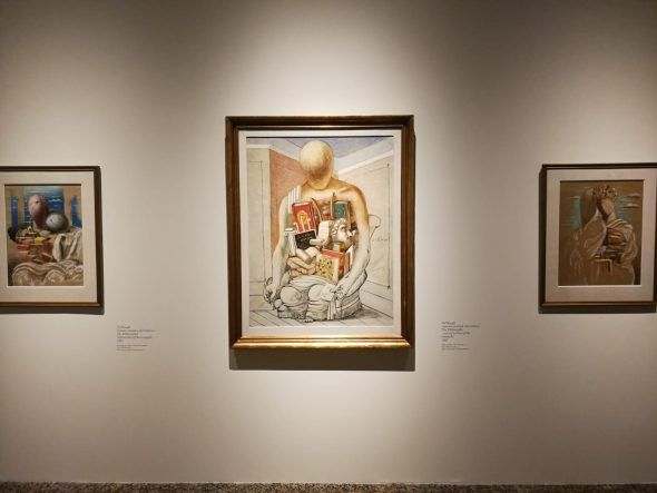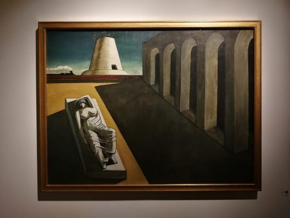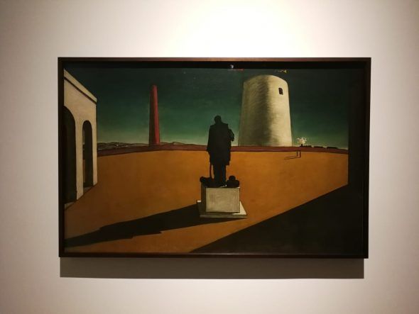 Ogni cosa si trova così sospesa, in un’attesa continua, una silenziosa potenzialità che mai si concretizza. E in esposizione c’è proprio tutto quell’universo di oggetti e simboli, presentati, come detto, secondo un ordine solo parzialmente cronologico e più specificatamente inteso a suggerire, a costruire, a immergere il visitatore nell’opera metafisica. C’è la biografia, costellata di movimenti – la Grecia, Parigi, Torino, Ferrara – che si mescola ai suggerimenti mitologici e genera opere dalla risposta differente a seconda della domanda che viene posta. Ci sono piazze deserte, stanze claustrofobiche, manichini e statue che le abitano senza saperlo. Ci sono immobili fumi cristallizzati in cieli feroci e inquietanti, provenienti da ferrovie che corrono verso una natura distante. I portici gestiscono oblunghe ombre che rapiscono i respiri: siamo già nell’angolo della scena, la presenza di qualcuno che non si vede incombe e dissemina il sospetto che ci sia molto di più di ciò che si vede.