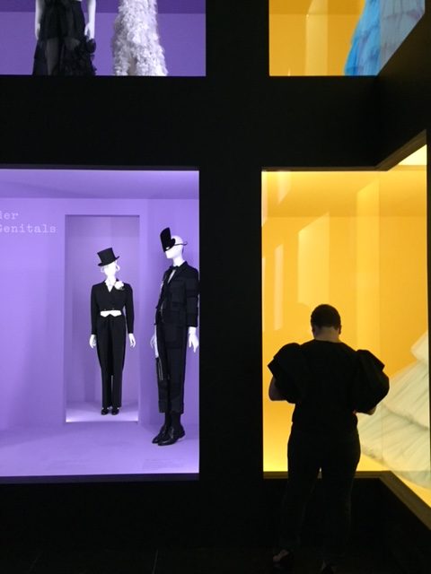 Questo sentimento di adesione verso un amore innaturale seducono il visitatore e lo preparano alla trasgressione sartoriale della sezione successiva. Attraverso un corridoio stretto e cieco, i pezzi unici di Balenciaga si alternano e dialogano con abiti di scena di Thierry Mugler e ancora completi aggressive da uomo firmati Jeremy Scott.
