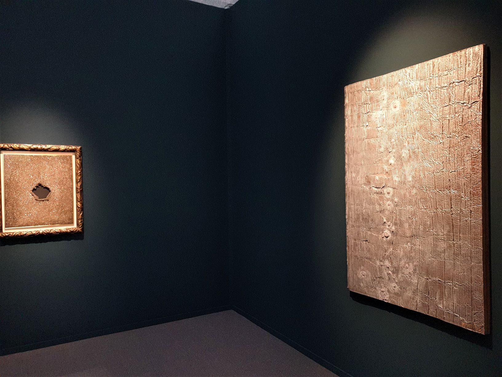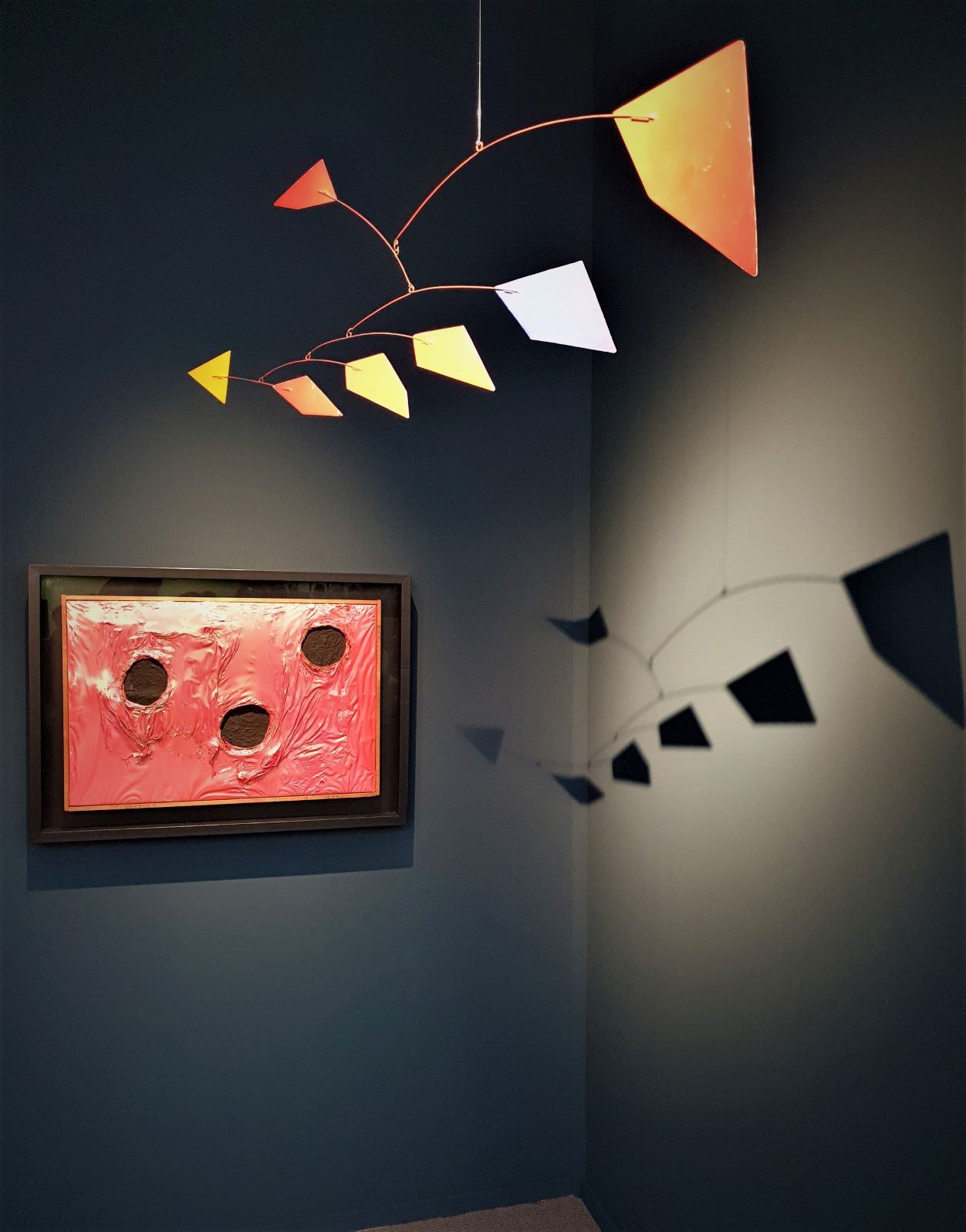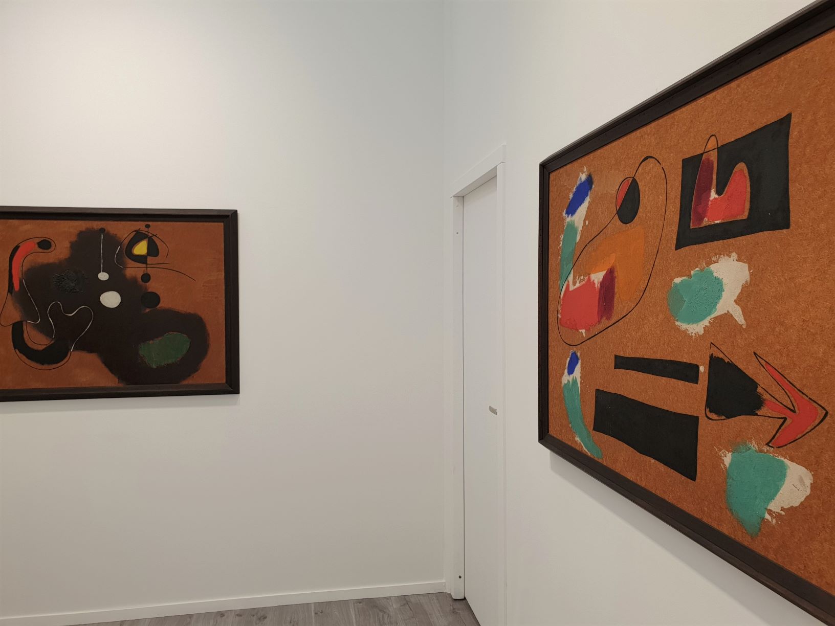 Kandinsky fluttuante in bilico e in Bilanciamento, come recita il titolo, sbattuto in faccia al visitatore nello stand. Superbo. A destra, si aprono le scogliere di Monet e una Marie-Therese di Picasso, a sinistra ci si inoltra, oltrepassando una Plastica combustionata di Burri del 1961, negli splendidi Mirò “serie masonite” del 1936, realizzati pochi anni dopo aver “ucciso la pittura”.