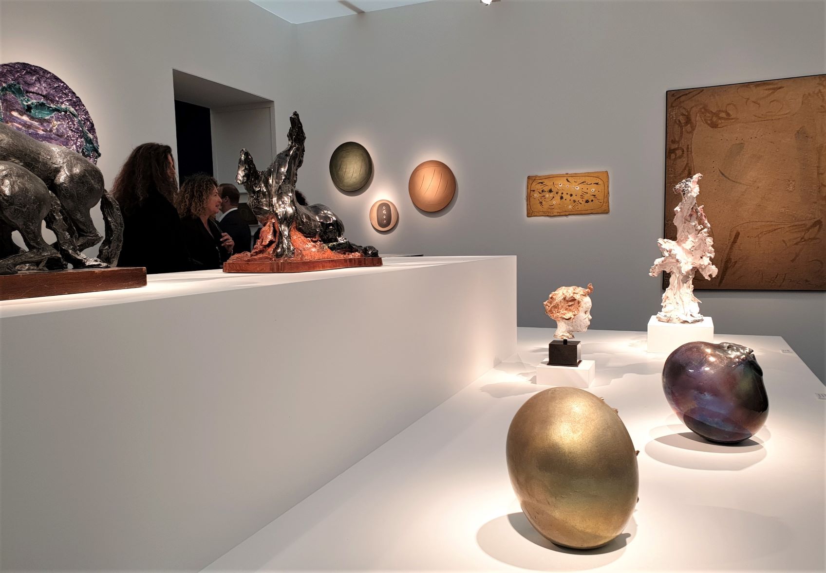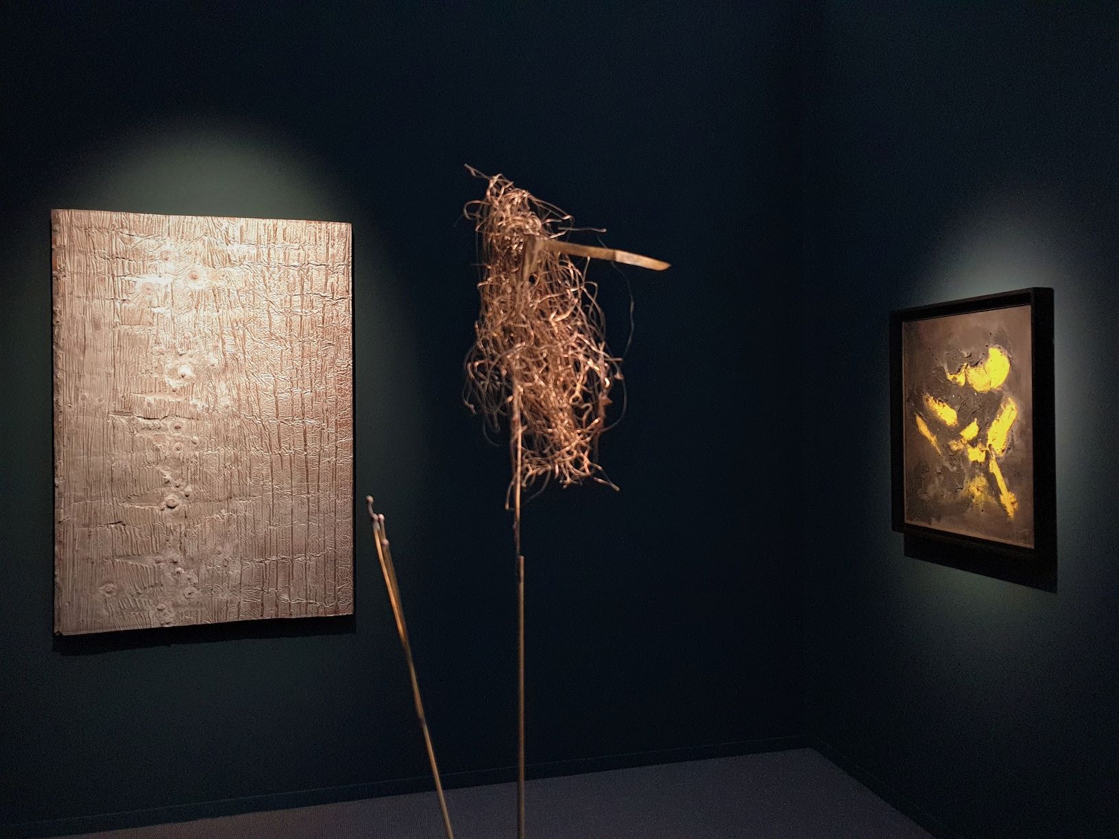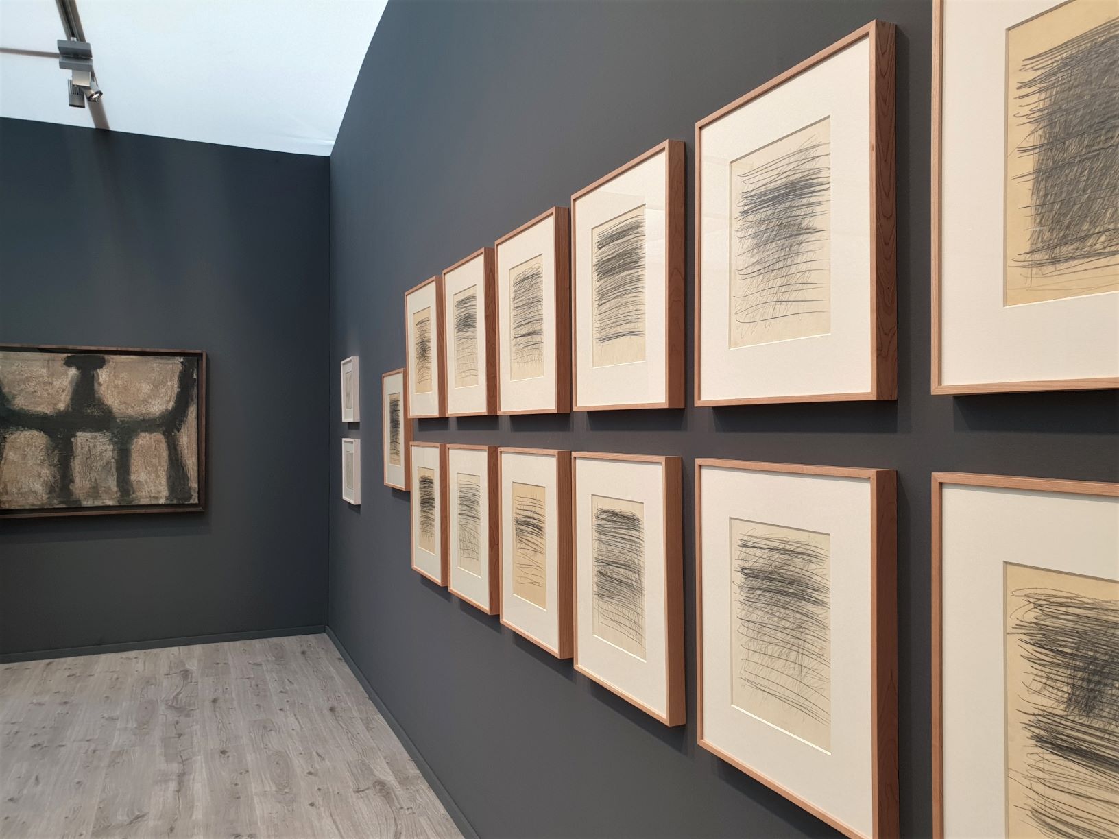 Kandinsky fluttuante in bilico e in Bilanciamento, come recita il titolo, sbattuto in faccia al visitatore nello stand. Superbo. A destra, si aprono le scogliere di Monet e una Marie-Therese di Picasso, a sinistra ci si inoltra, oltrepassando una Plastica combustionata di Burri del 1961, negli splendidi Mirò “serie masonite” del 1936, realizzati pochi anni dopo aver “ucciso la pittura”.