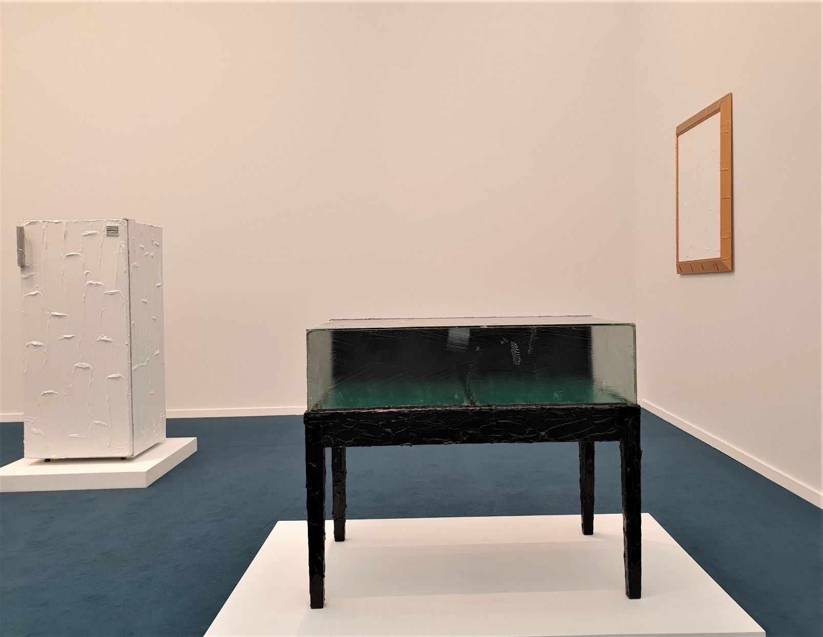 Un parallelepipedo densamente rosso, tracotante pittura, a centro stand. La pittura che si fa marcatamente scultura, oggetti d’uso comune rivestiti di pasta pittorica cristallizzati nel tempo, siano una macchina fotografica, un frigorifero, uno specchio. Massimo De Carlo presenta una sintesi-selezione della parabola di Bertrand Lavier, nome storico della galleria milanese, dal 1980 al 1998.