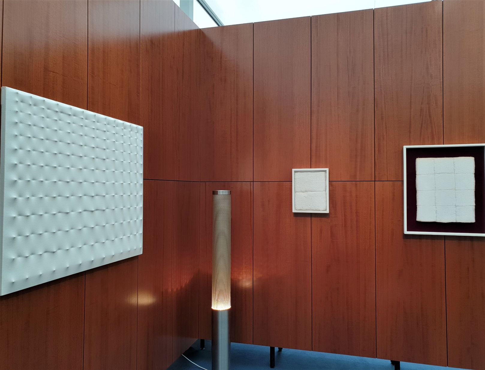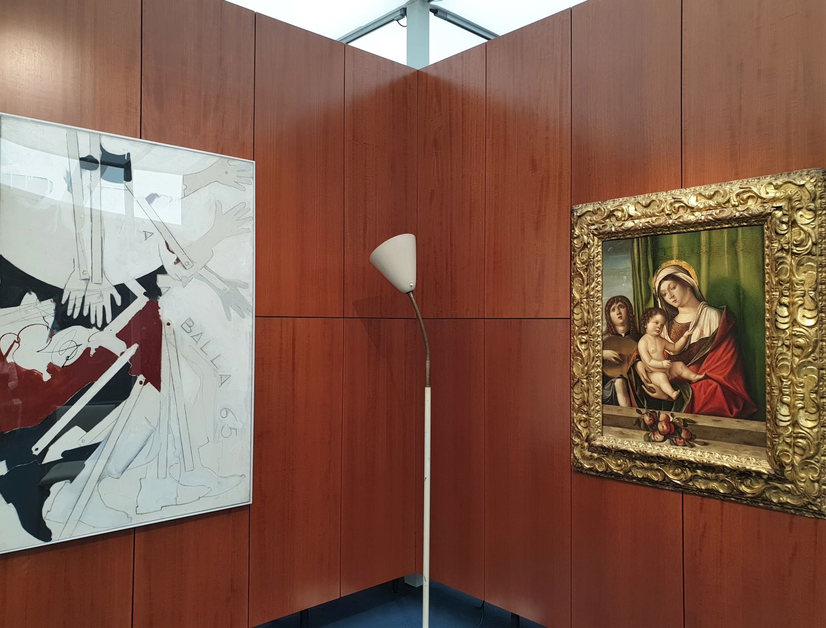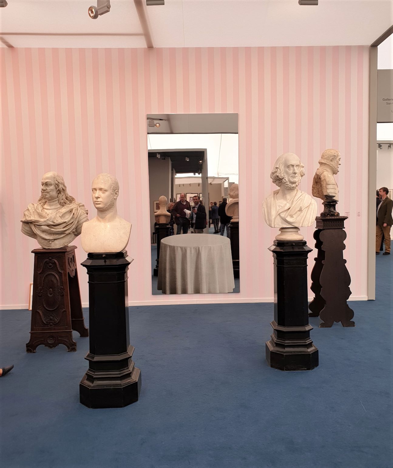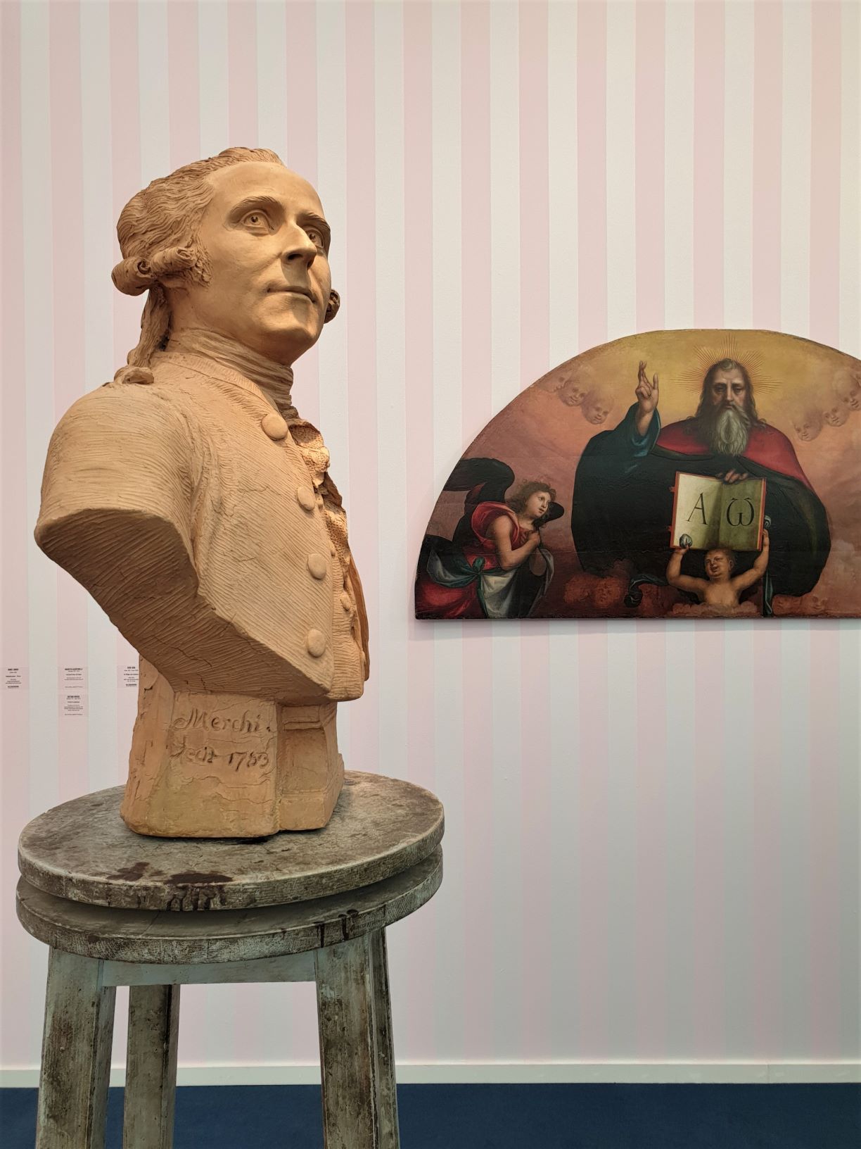 Conciliare il crocifisso di legno policromo cinquecentesco di Giovan Angelo del Maino con l’Obstruct Disrupt di Kiki Smith del 1995. Continua e Bacarelli&Botticelli insieme per uno stand dove busti settecenteschi fluttuano tra le pareti rosa-bianche di Buren riflettendosi in Pistoletto.