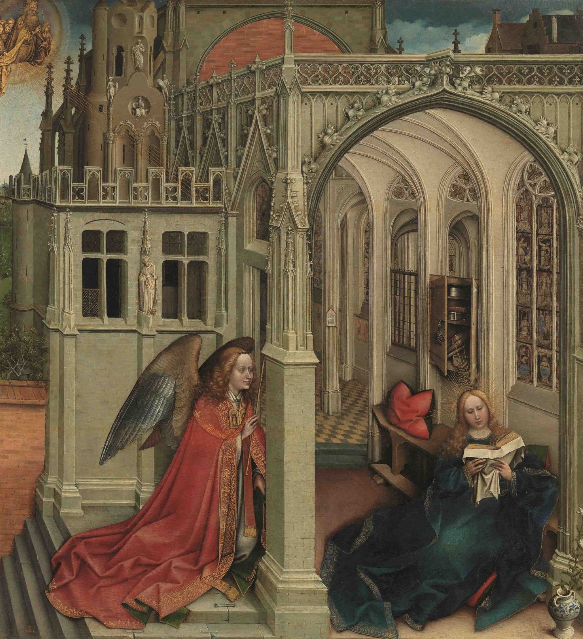 Con l’intento di creare un confronto e un dialogo tra due mondi e artisti differenti, l’opera è stata posta accanto al tabernacolo raffigurante l’Annunciazione e Adorazione dei Magi di Beato Angelico (Vicchio, 1395 – Roma, 1455). Le due opere, entrambe raffiguranti l’Annunciazione, appartengono allo stesso periodo storico: il tabernacolo di Beato Angelico è stato datato 1425 mentre l’opera di Campin tra il 1425 al 1430.