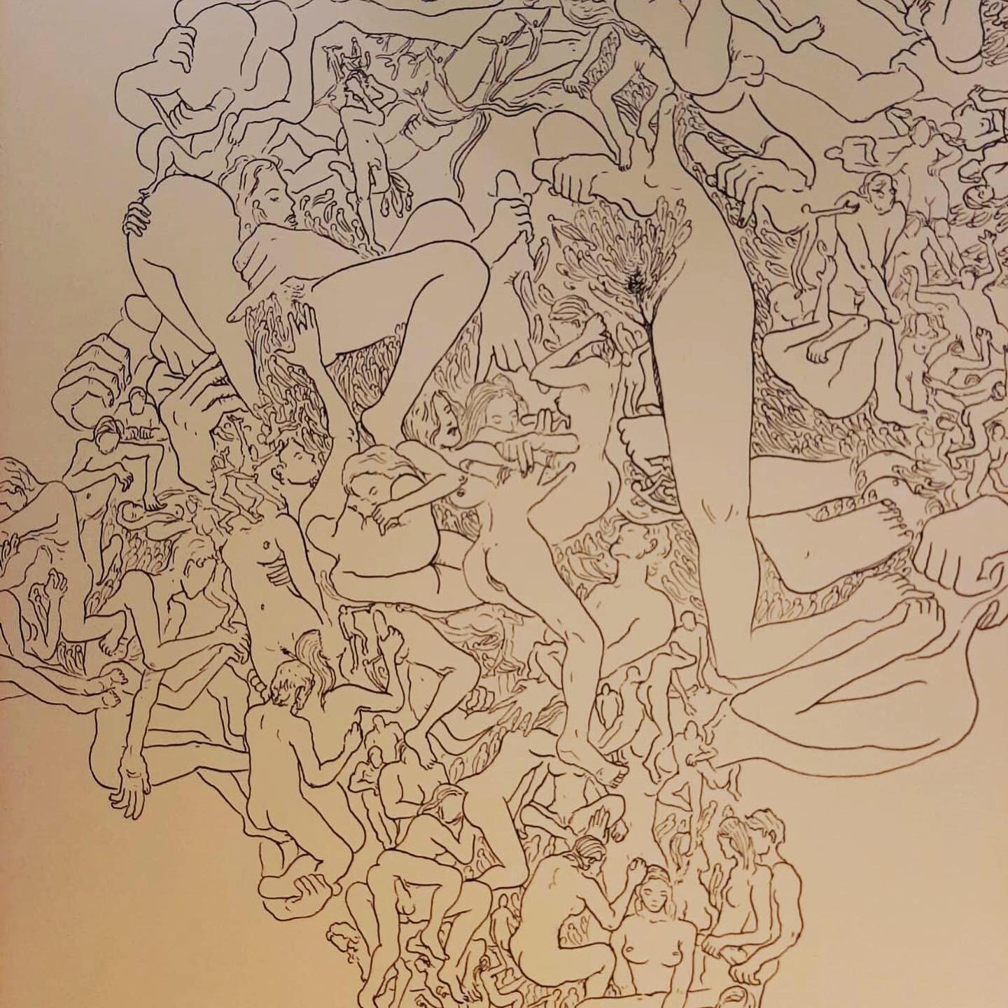 Simone Pellegrini traccia i suoi “schizzi preparatori” proprio sui libri. Questi primi tratti, che danno l’impressione delle incisioni primitive, fanno un po’ da trait-d’union tra passato e futuro. Ma guardandoli attentamente ritroviamo le nostre identità fluide, liquide, in costante connessione. Il corpo è un magnifico luogo di proiezioni utopiche! attraverso di esso ogni trasformazione è possibile. I corpi androgini di Hans Bellmer e gli ibridi umano-animali di Cécile Reims lo mostrano. Il sesso in orbita di Damien MacDonald è uno dei casi in cui l’utopia sfiora la realtà. Benché non sia ancora stato sperimentato, sono sicura che presto ci arriveremo.