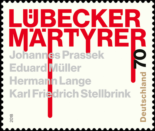 Firmato da Christoph Jung il francobollo porta in grande evidenza la scritta “LŰBECKER MÄRTYRER”, Martiri di Lubecca, impressa in rosso che, in corrispondenza della seconda e terza “R” prosegue indicando il sangue che cola così come, sia pure in misura meno vistosa, cola dalla seconda “E” della prima riga e dalla “T” della seconda riga. Sotto, in grigio, i nomi dei quattro martiri. I sacerdoti Johannes Prassek, Eduard Müller ed Hermann Lange e il pastore evangelico-luterano Karl Friedrich Stellbrink, decapitati uno dopo l’altro, il 10 novembre 1943 nel carcere di Holstenglacis, ad Amburgo, in quanto rei di “disfattismo, malizia, favoreggiamento del nemico e ascolto di trasmissioni ostili” nonché di aver prestato soccorso ai perseguitati a qualunque razza appartenessero. Uccisi in “odium fidei”, i quattro martiri “rappresentavano una vera spina nel fianco del regime. Furono giustiziati perché nessuno di essi rinunciò alla propria fede e alla morale cattolica” e beatificati il 25 giugno 2011. La celebrazione ha costituito una sorta di “ecumenismo del sangue”, in quanto non ha mancato di rendere il doveroso omaggio al pastore protestante che nella cattedrale di Lubecca riposa assieme ai tre beati cattolici, sotto una lastra di marmo sulla quale sono incise queste parole: “Fecero fino all’ultimo il loro dovere di preti».