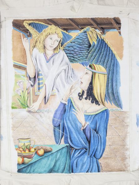 Premio internazionale d’arte filatelica cristiana, il “San Gabriele” non manca di promuove l’arte. Quella che si pratica dietro le sbarre, nelle carceri. In laboratori, come quello attivo nella Casa di reclusione di Bollate intitolato ad Artemisia e portato avanti con passione e competenza da Nadia Nespoli, che fino al 31 ottobre nel Centro eucaristico San Raffaele di Milano (via San Raffaele 4), propone l’installazione “Maria: il filo della devozione”. E’ qui che, sotto lo sguardo attento e vigile di Nadia Nespoli ha preso corpo e forma “L’Annunciazione” di Stefano Piacentini trasformata in cartolina e in annullo da parte di Poste Italiane. Quasi a rimarcare la provenienza espiativa, per la realizzazione l’autore ha utilizzato (beninteso preventivamente autorizzato) una porzione di lenzuolo, ormai in disuso, fornito dall’Amministrazione carceraria. Sopra il quale ha steso del gesso frammisto a vinavil. In modo con concreto che vuol dimostrare “che anche dalle situazioni spiacevoli possiamo qualcosa di buono”. L’immagine esalta la “sorpresa” dell’evento con l’Angelo Gabriele che apparendo la Madonna, suscita appunto “sorpresa e meraviglia“ e, col dito che indica l’alto, indica la sua provenienza. Chi l’ha mandato. Essenziale l’ambiente, con un solo mobile: “un tavolo con una brocca, che richiama l’acqua (la vite e il suo scorrere), ma anche il vino (il sangue di Cristo) e una canestra con la frutta che a sua volta rimanda alla vita – sottolinea Stefano Piacentini- semplice e contadina piena di speranze, fatiche, gioie e dolori”.